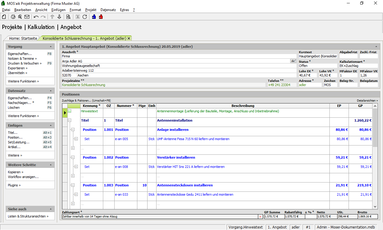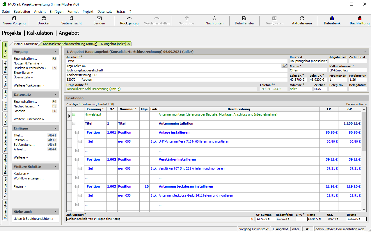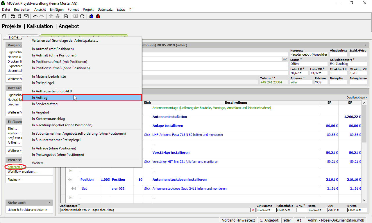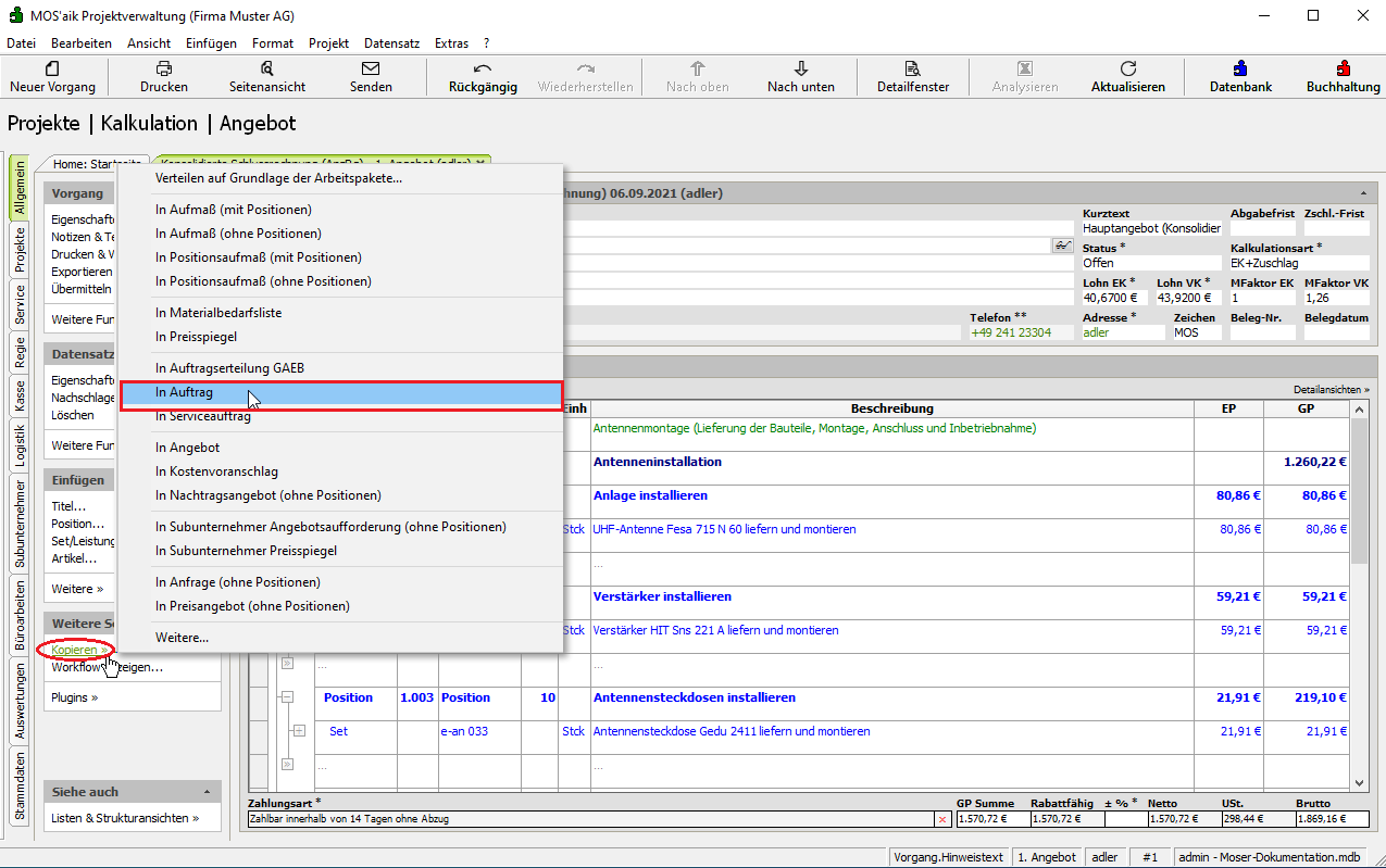 Erstellen Sie aus einem Angebot einen ⇨Auftrag und daraus die ⇨1. Zwischenrechnung.