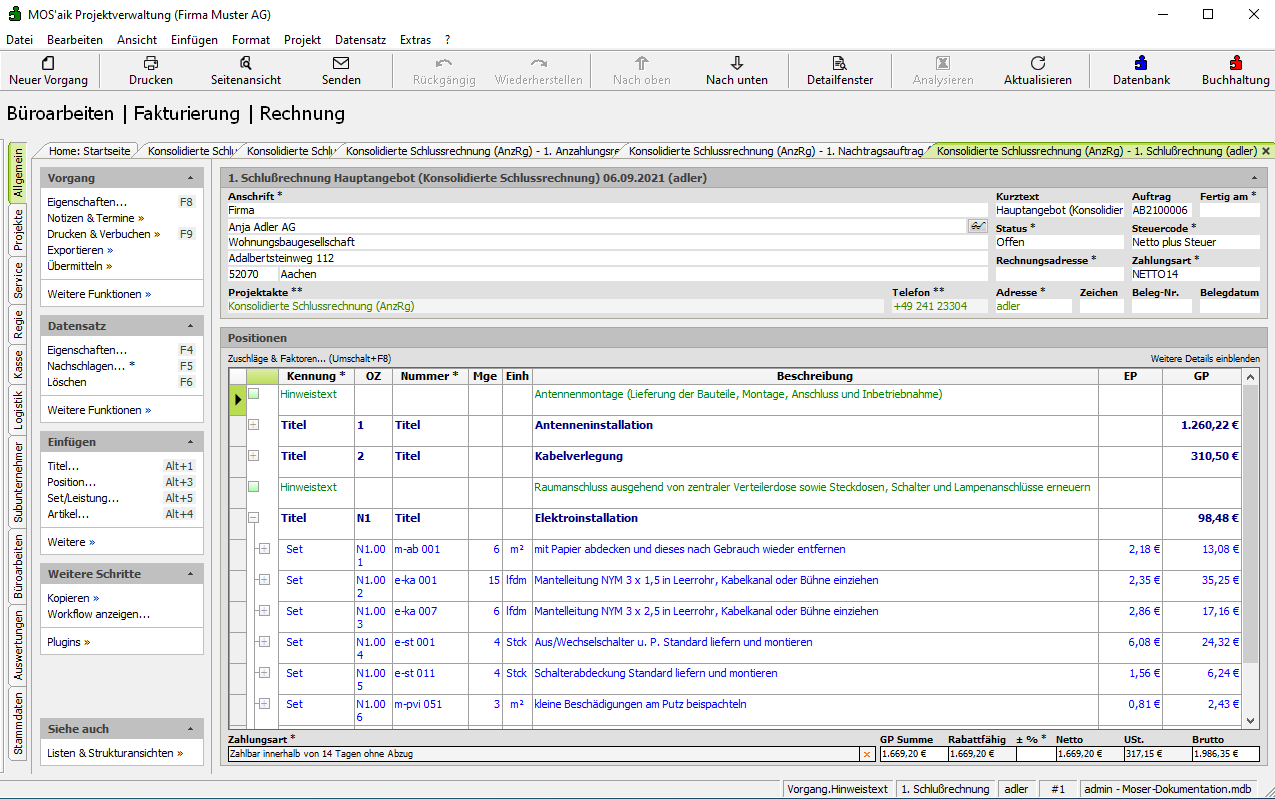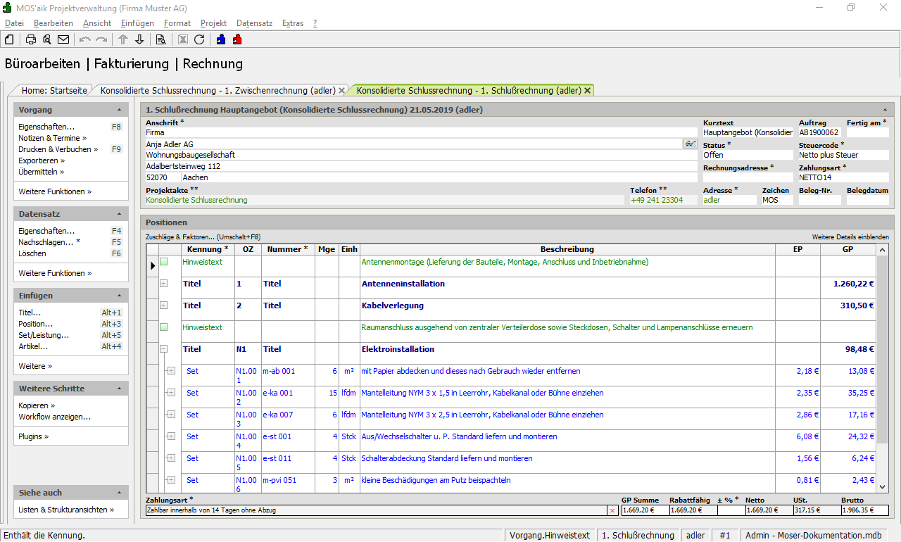 Für den (Haupt-)Auftrag und die Nachtragsaufträge muss eine konsolidierte Schlussrechnung erstellt werden.