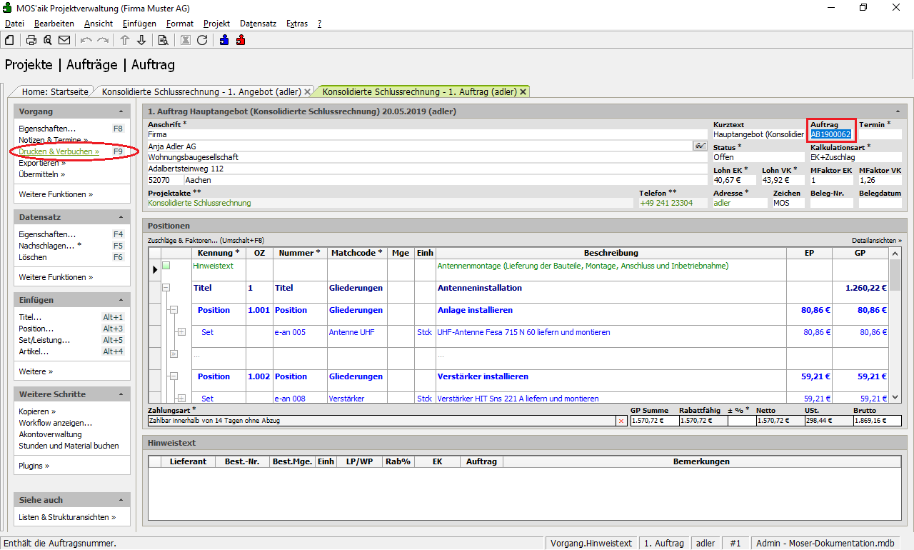 Erstellen Sie aus einem Angebot einen ⇨Auftrag, daraus die ⇨1. Zwischenrechnung und drucken diese.