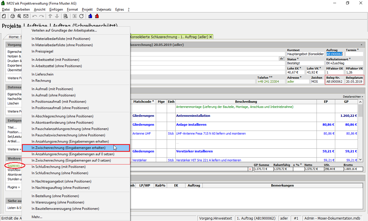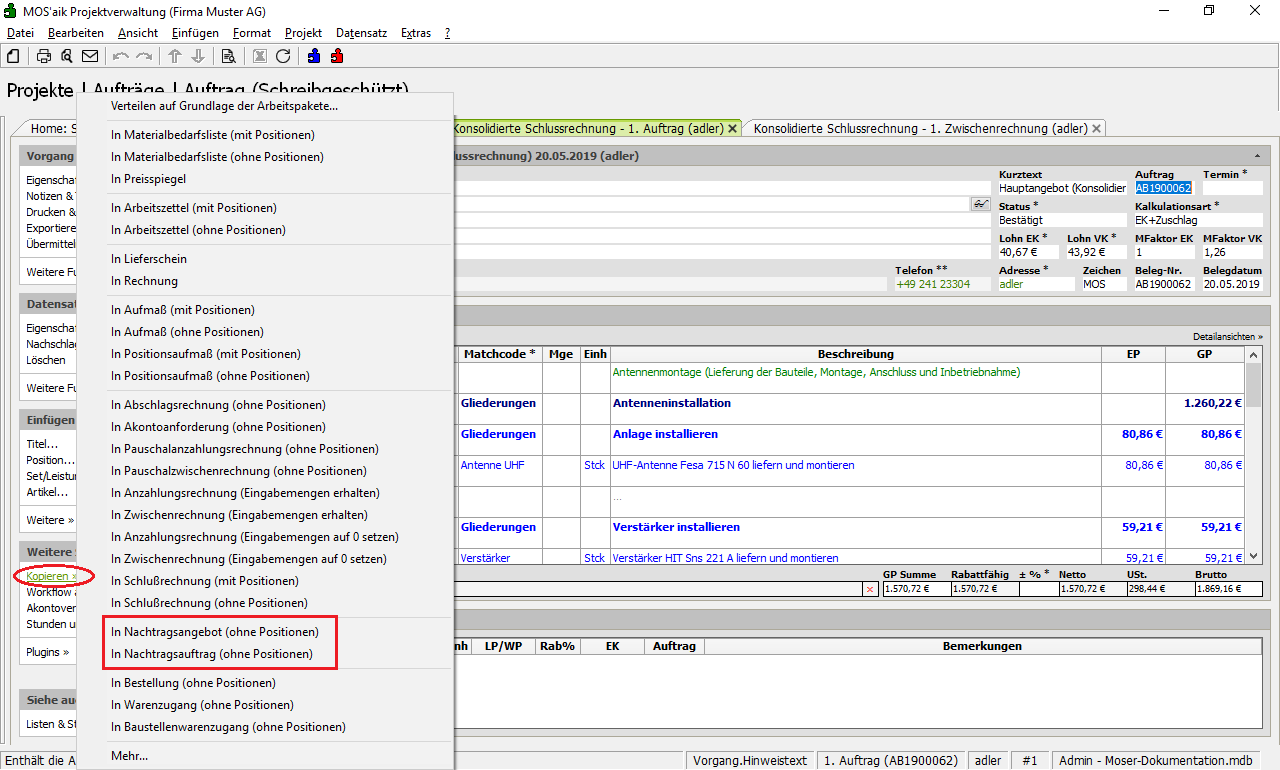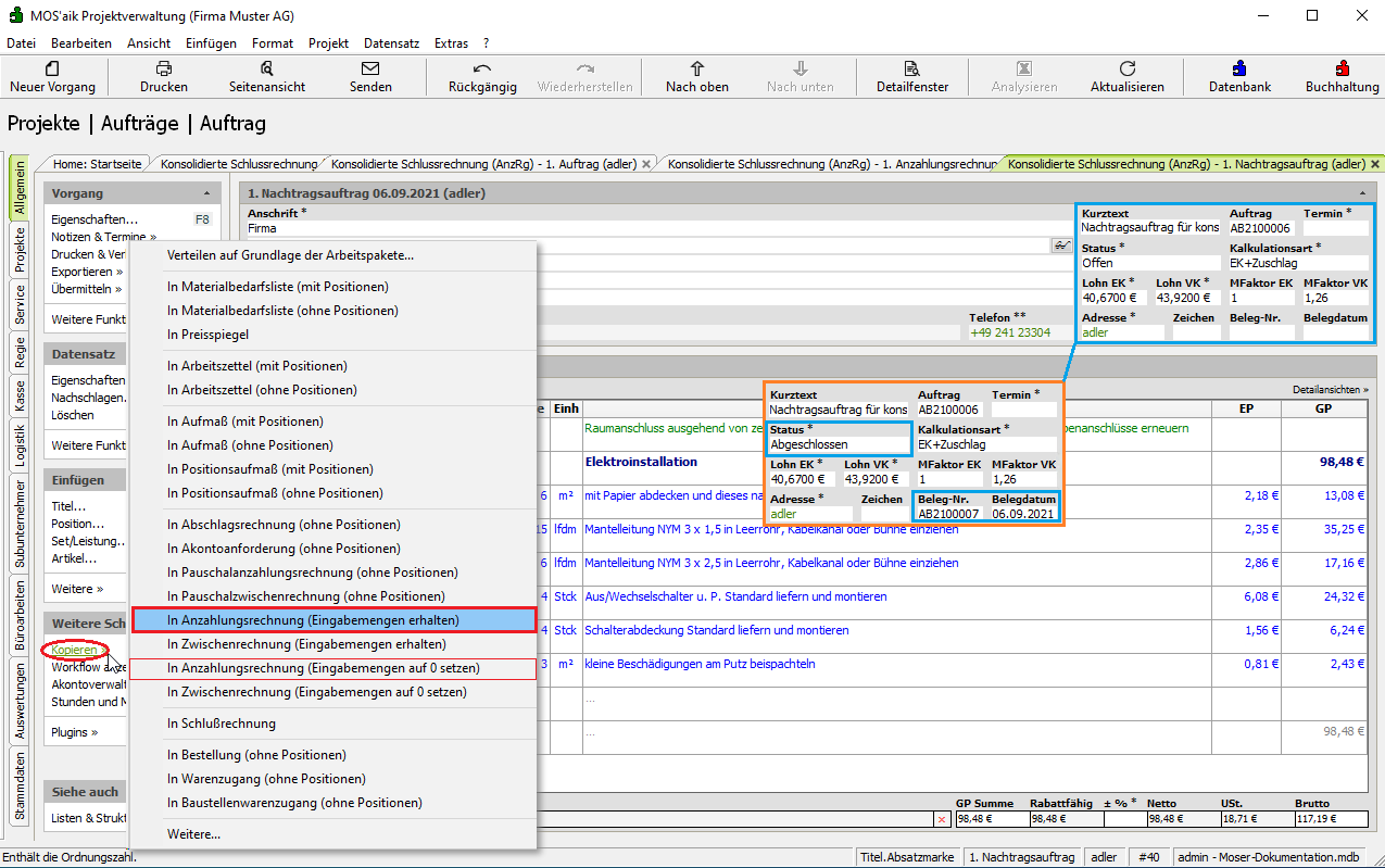 Beim Kopieren eines Nachtragsauftrags in eine Anzahlungs- oder Zwischenrechnung des (Haupt-)Auftrags wird der Status des Nachtragsauftrags in „Abgeschlossen“ geändert.