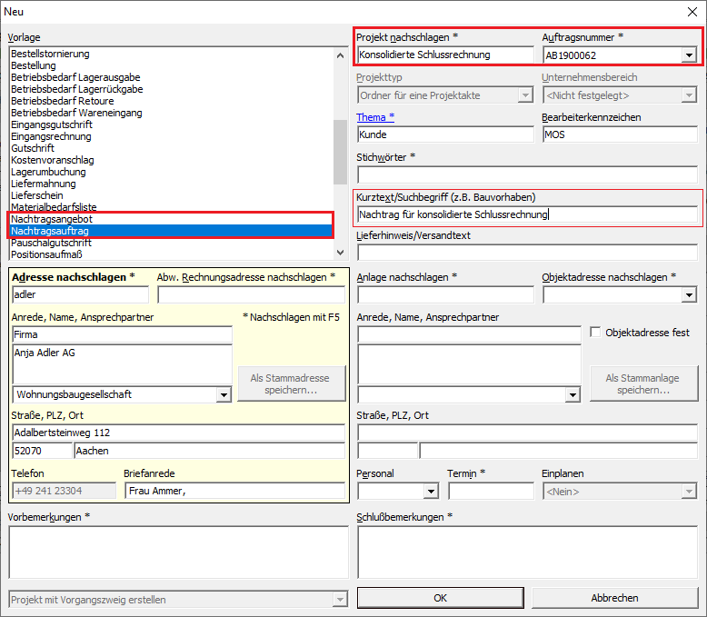 Verwenden Sie deshalb für eine konsolidierte Schlussrechnung unbedingt die Vorgangsart Nachtragsauftrag!