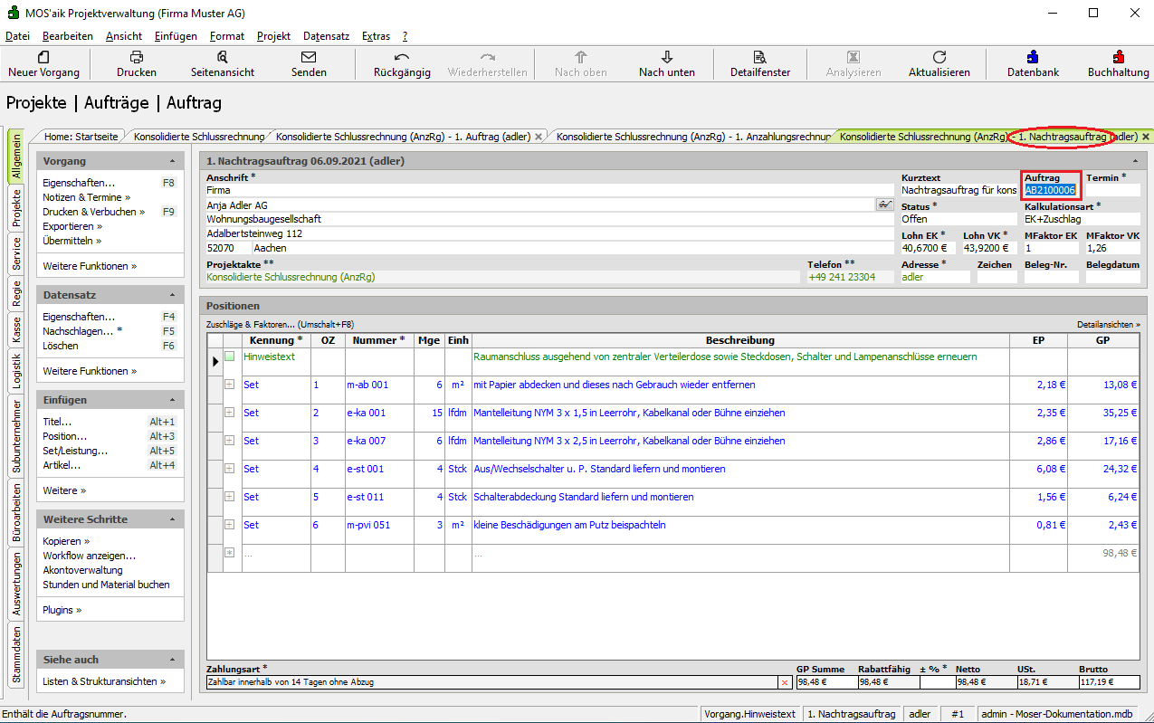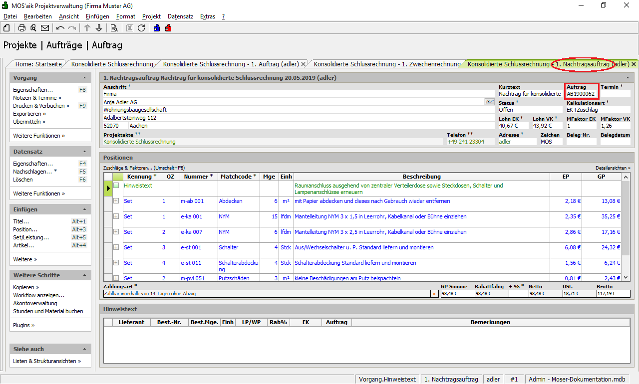 Dadurch wird sichergestellt, dass solche Nachtragsaufträge beim Erstellen der Schlussrechnung mit einbezogen werden.