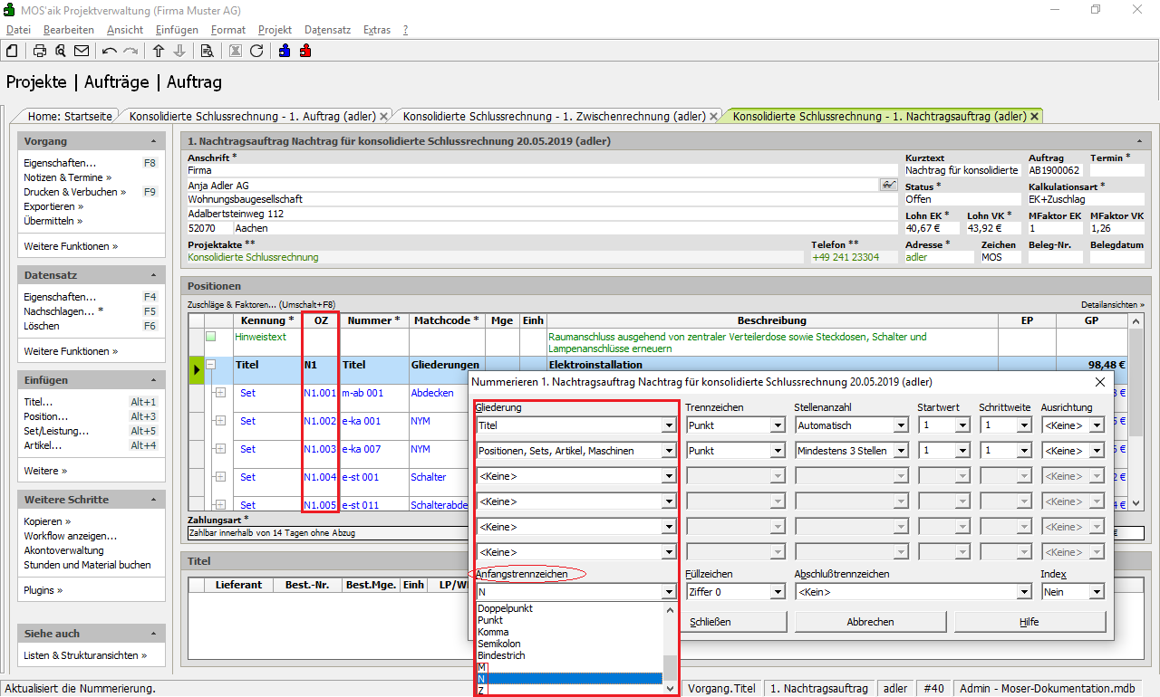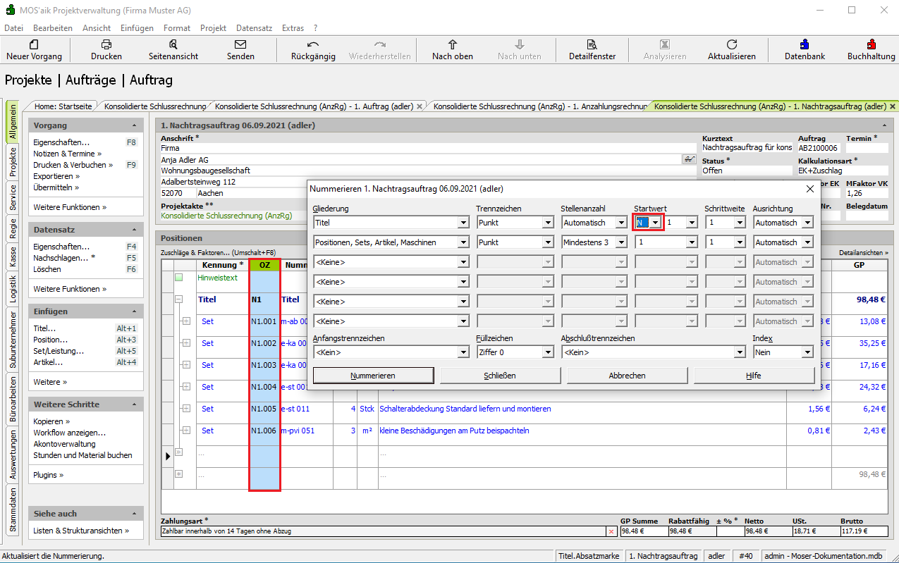 Nachtragsaufträge müssen eine eigene und eindeutige OZ-Nummerierung enthalten.