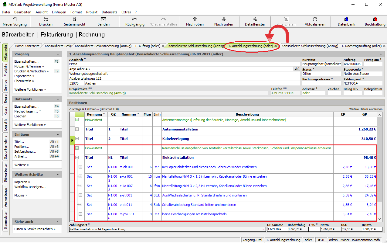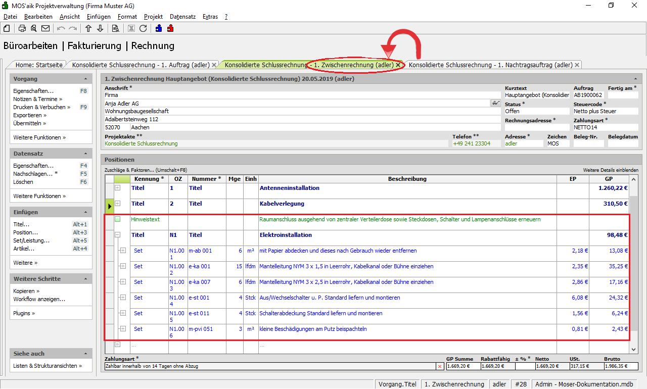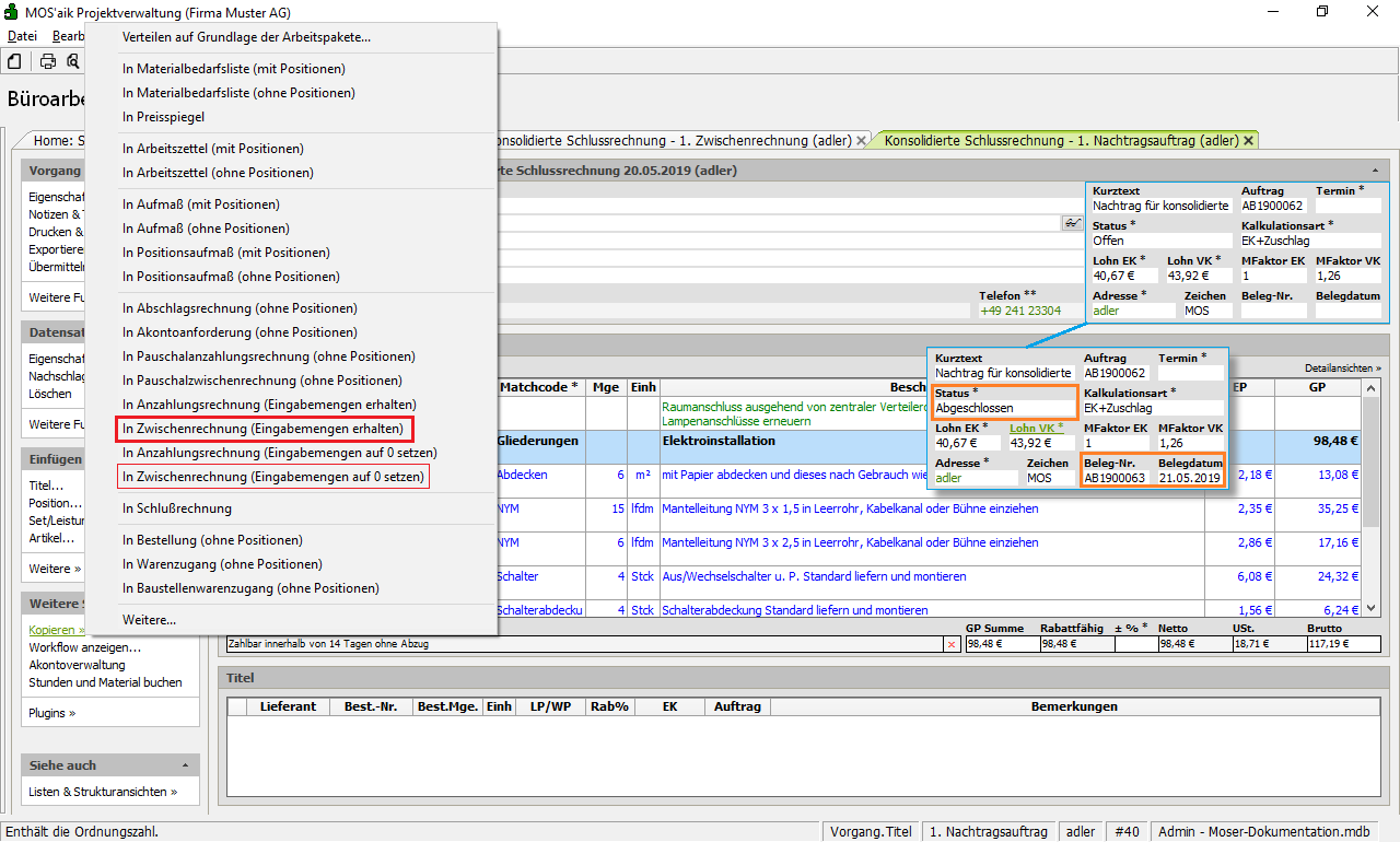 Die Positionen des Nachtragsauftrags werden automatisch in die noch ungedruckte 1. Zwischenrechnung eingefügt: