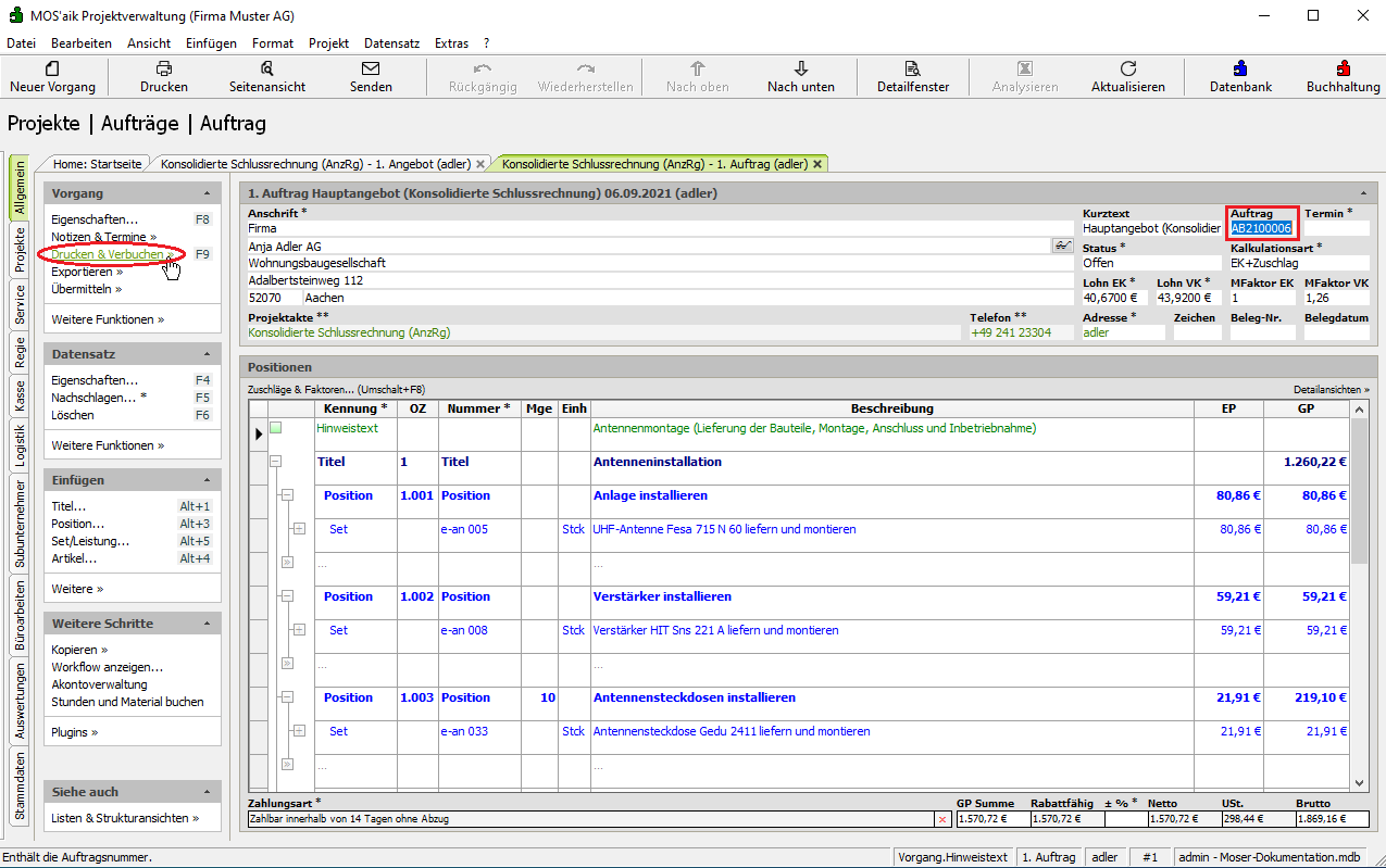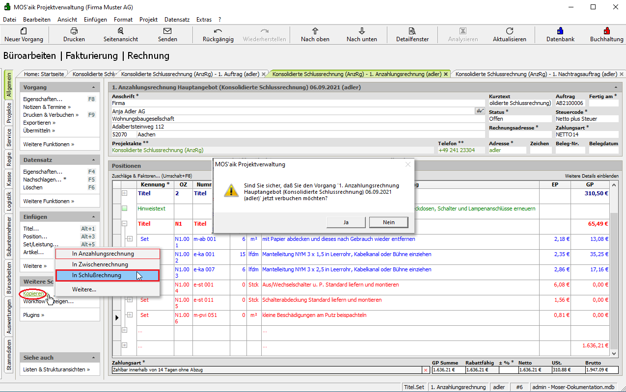 Die Positionen des Nachtragsauftrags werden automatisch in die noch ungedruckte 1. Anzahlungsrechnung eingefügt: