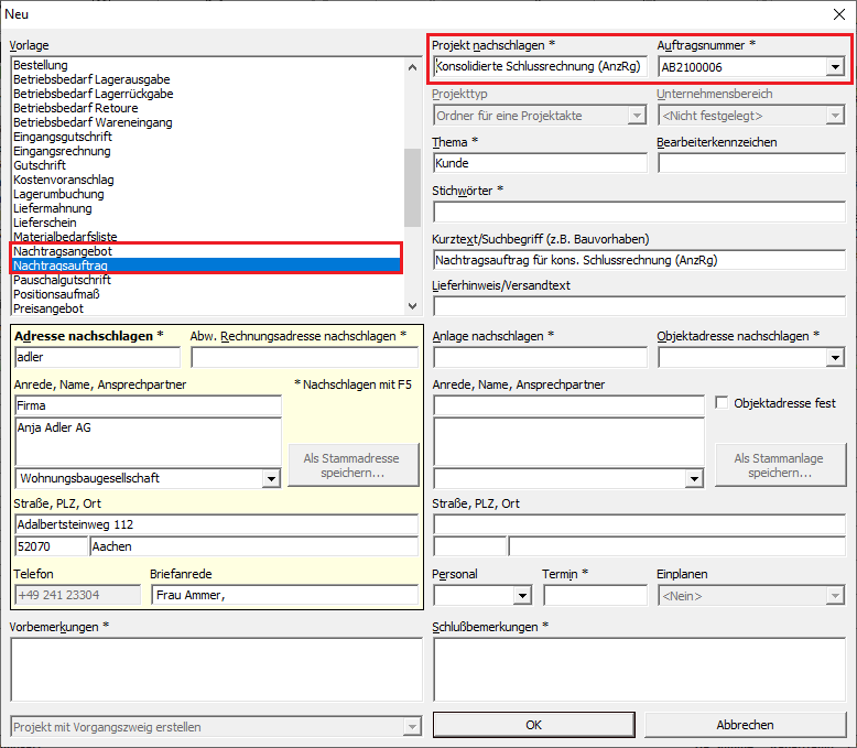 Nachtragsaufträge müssen in demselben Projekt/Ordner wie der Hauptauftrag angelegt werden und dieselbe Auftragsnummer wie der (Haupt-) Auftrag haben; also auf Basis eines Hauptauftrags erstellt werden.