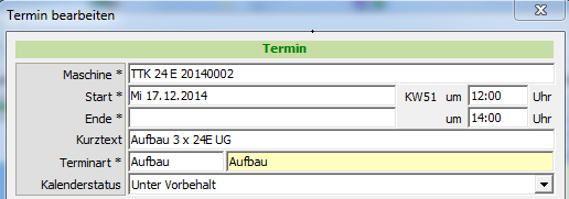 Mit einem weiteren Klick der Maus oder der Taste wird der Eingabedialog für den Termin geöffnet. Die Felder "Maschine", "Start", "Start Uhrzeit", "Ende Uhrzeit", "Kurztext", "Kalenderstatus", "Besitzer" und "Erstanlagedatum" werden automatisch voreingestellt.