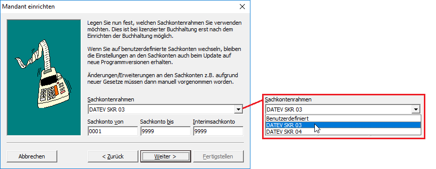 Wenn der Sachkontenbereich beim Update unverändert bleiben soll, kann dazu die Einstellung für den Sachkontenrahmen vor dem Update unter → auf Benutzerdefiniert eingestellt werden. Die Umstellung auf einen benutzerdefinierten Sachkontenrahmen lässt sich nicht ohne weiteres rückgängig machen! Lassen Sie sich ggf. vom Moser Service zu diesem Thema beraten und lesen Sie die Hinweise unter "Eigene Sachkonten". |
