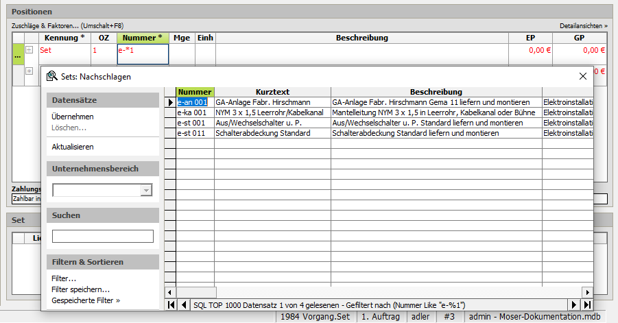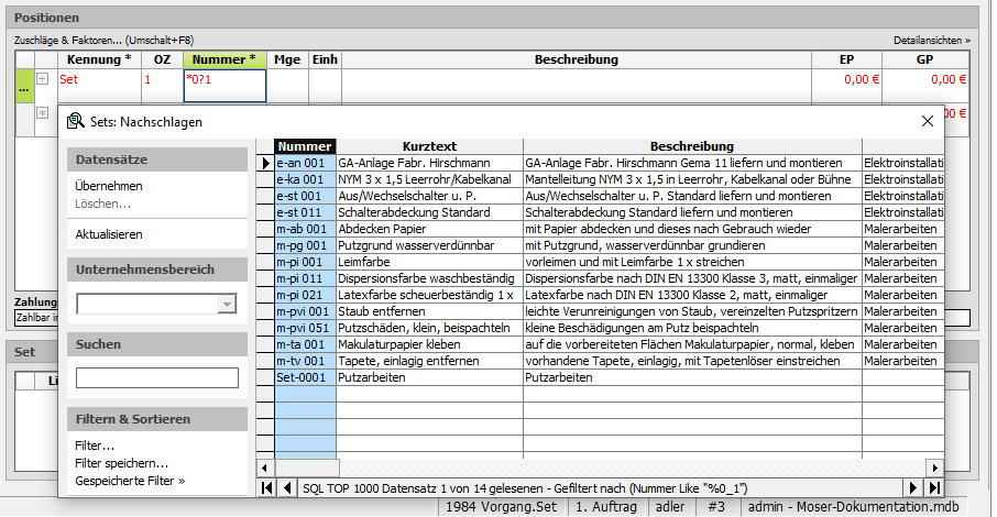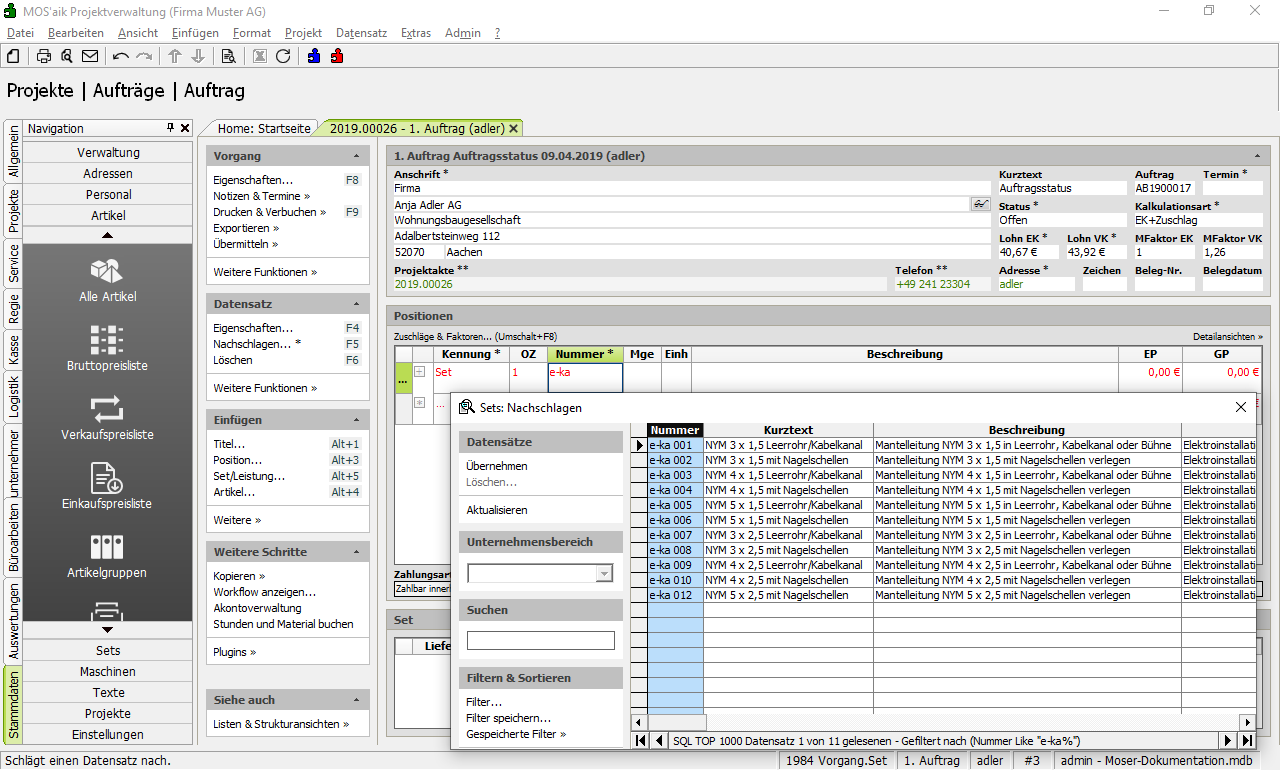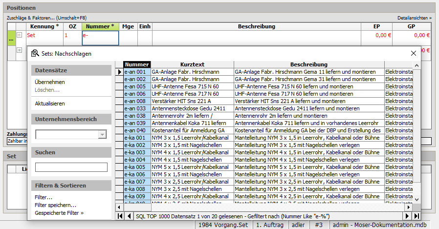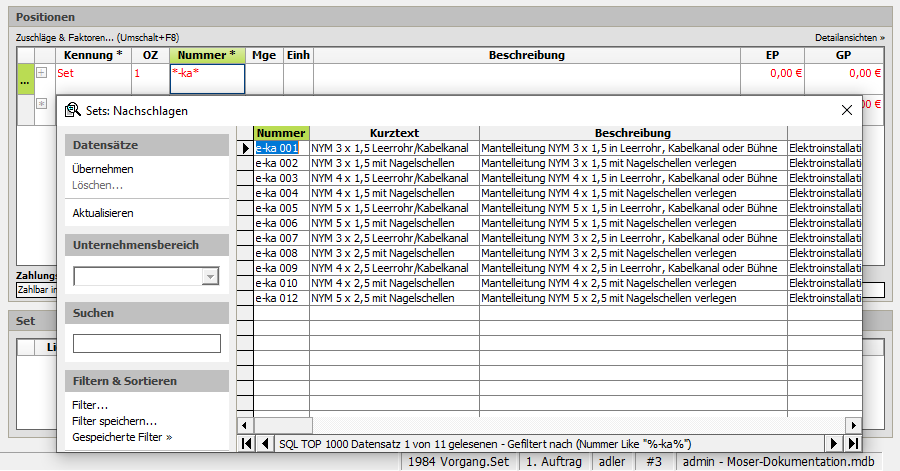 Der Nachschlagedialog wird geöffnet und zeigt anstelle aller verfügbaren Leistungen lediglich noch die verfügbaren Leistungen zum Verlegen diverser Kabelarten (NYM) an:
