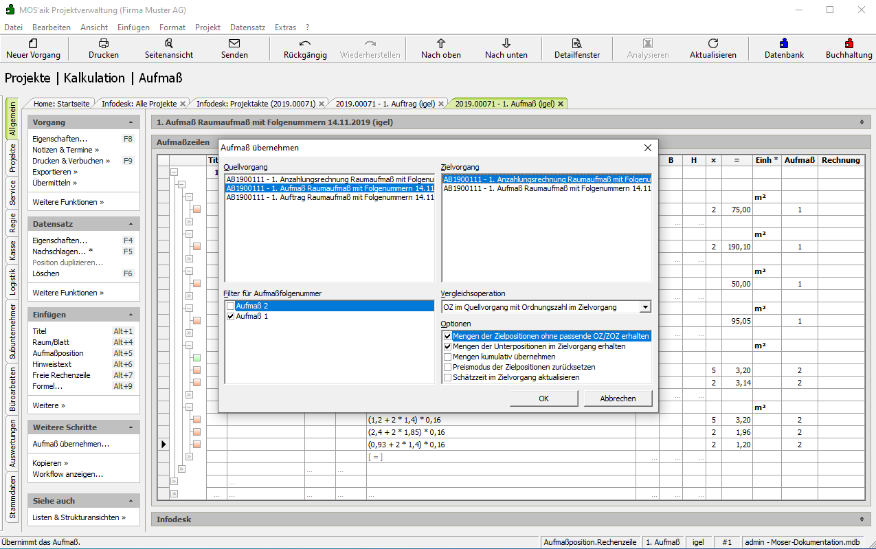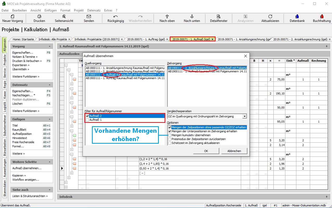 Im Beispiel werden alle Aufmaße mit Folgenummer "1" in den Zielvorgang übernommen.