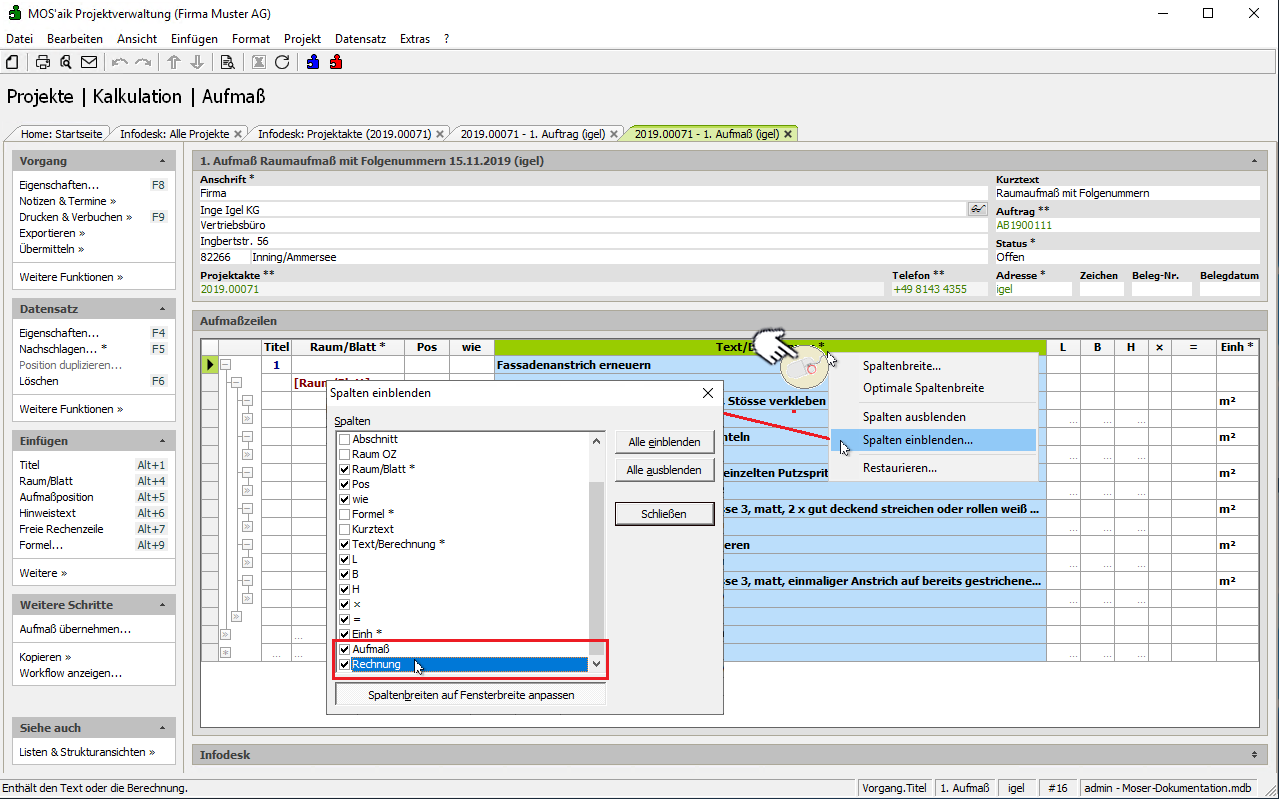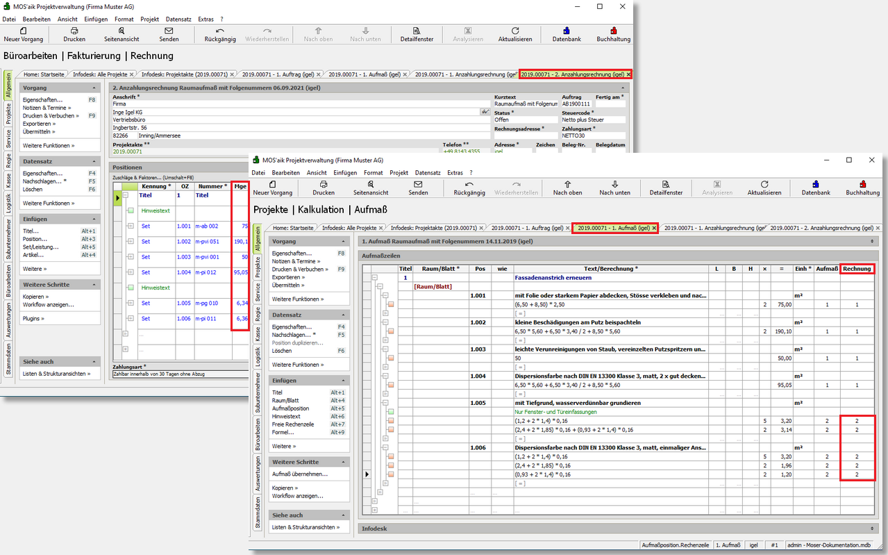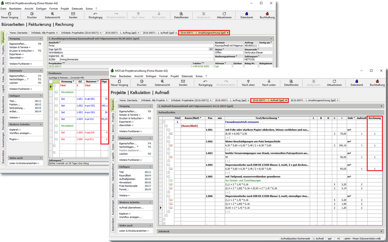 Aufmaß(Aufmaßfolgenummer) undRechnung(Rechnungsfolgenummer) ein: