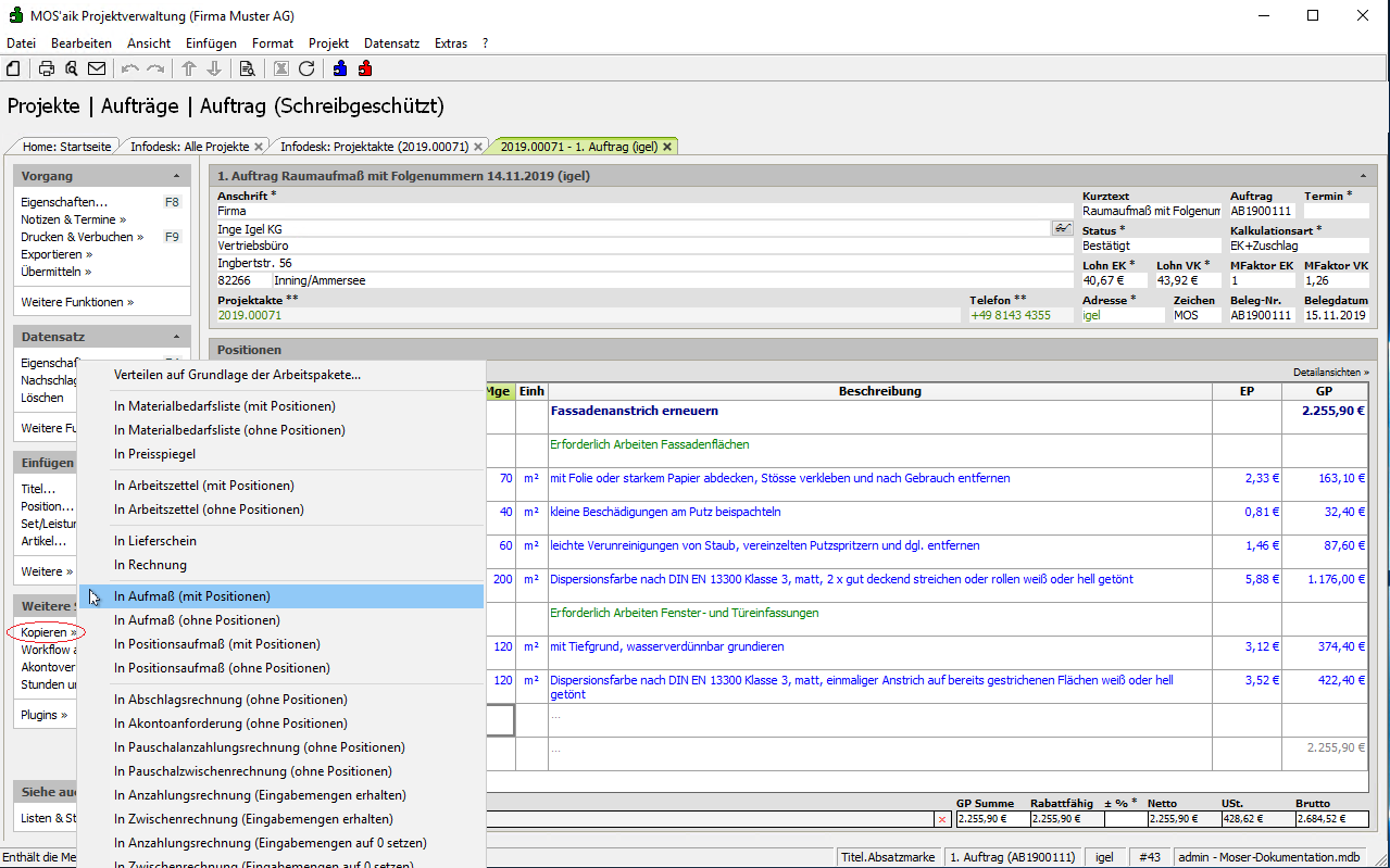 Öffnen Sie den Quellvorgang (z.B. Auftrag) und rufen Sie die Funktion Kopieren » und In Aufmaß (mit Positionen) auf, um ein neues Aufmaß zu erstellen: