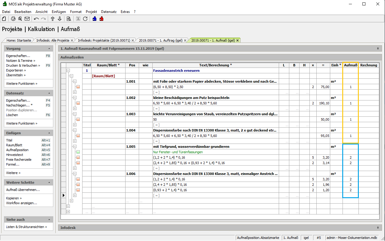 Aufmaßautomatisch die höchste im Vorgang verwendete Aufmaßfolgenummer (bzw. die zuletzt vergebene), beginnend mit "1", zugeordnet (siehe gelbe Markierung). Sie können jederzeit entscheiden weitere Aufmaße einer anderen Folgenummer zuzuordnen, um beispielsweise Aufmaße eines Baustellenbesuchs zu gruppieren (siehe blaue Markierung). Ändern Sie dazu einfach die gewünschte Nummer entsprechend ab.