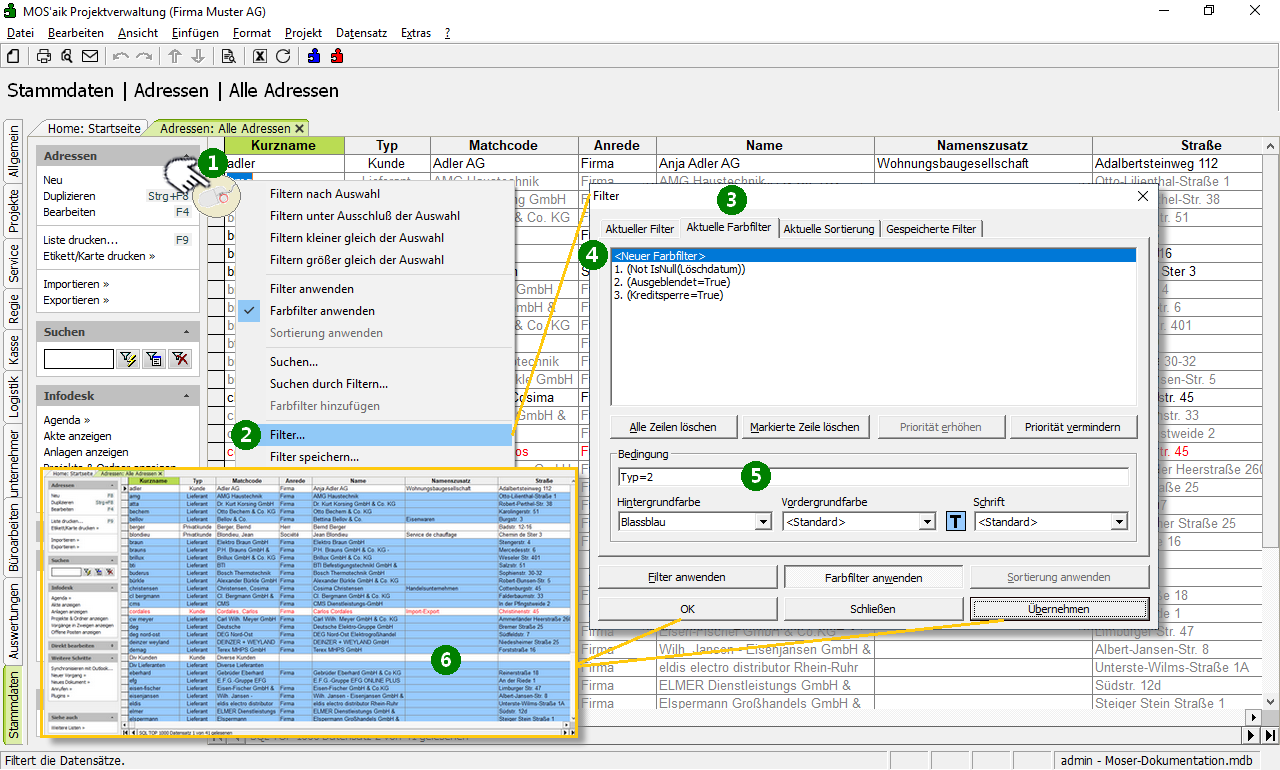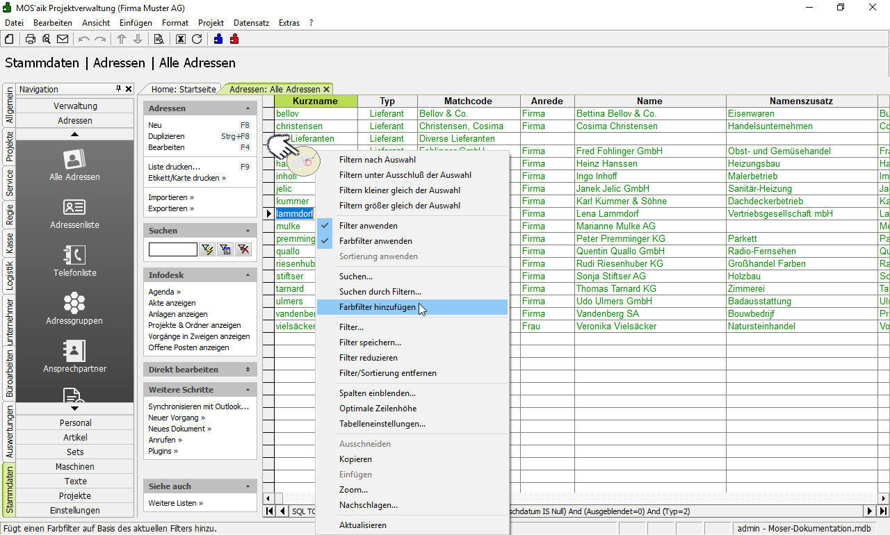 Standardmäßig sind Farbfilter zur Kennzeichnung diverser Eigenschaften von Datensätzen bereits voreingestellt. So werden beispielsweise ausgeblendete Adressen grau und Adressen mit Kreditsperre rot gekennzeichnet.