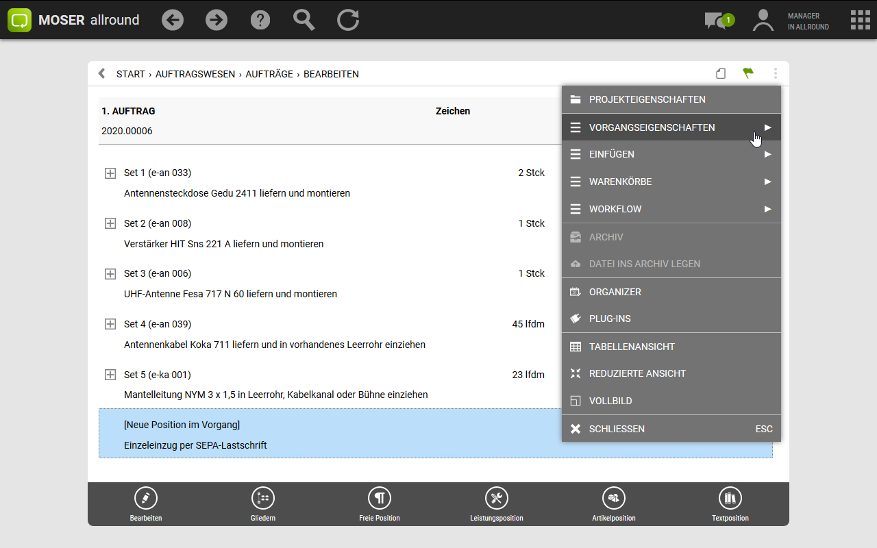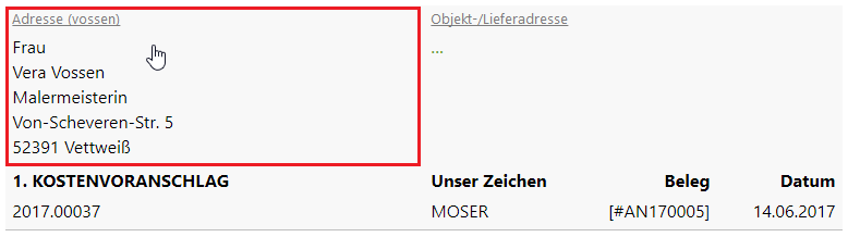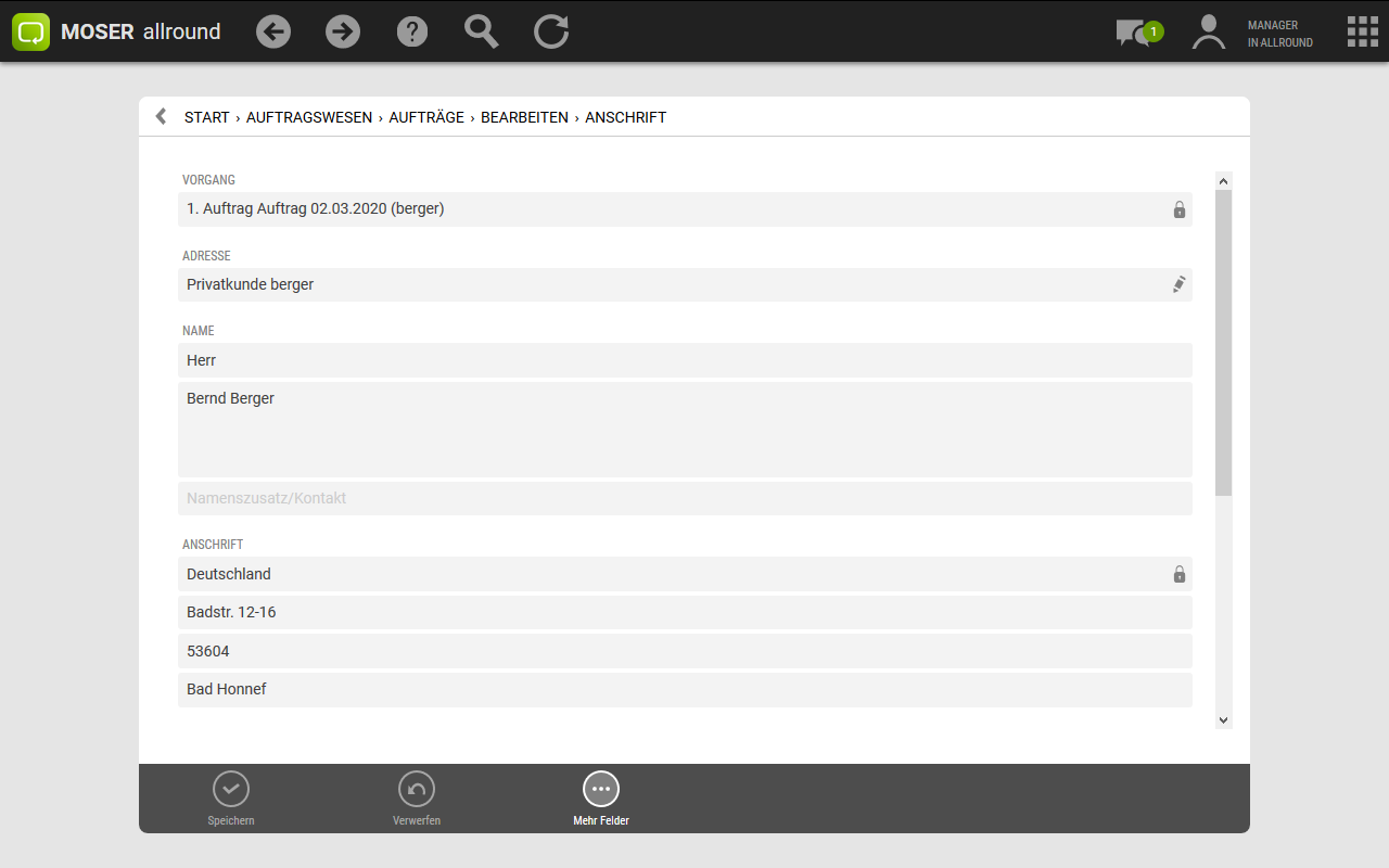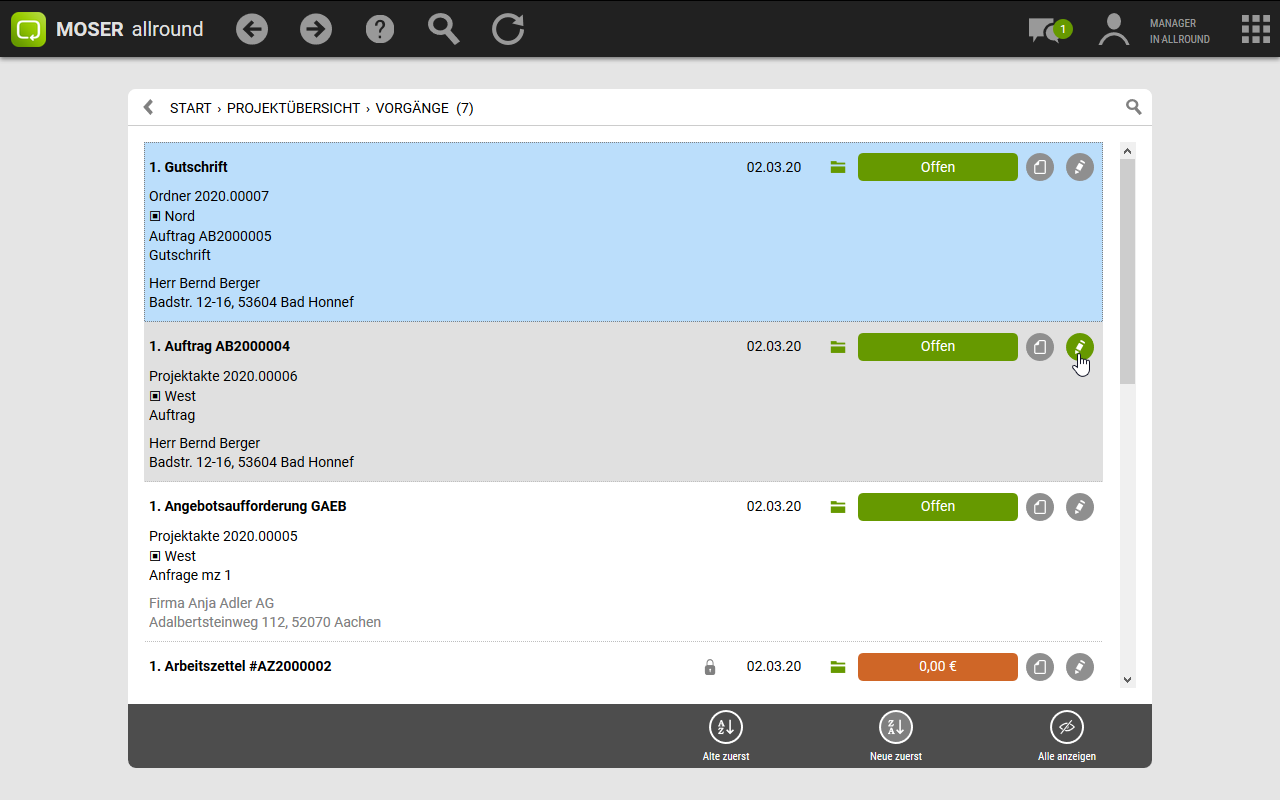 MOSER 'allround' unterstützt verschiedene Adressen innerhalb eines Vorgangs. Um z.B. die Vorgangs-, Rechnungs- oder Baustellenadresse nachträglich zu ändern, wählen Sie zunächst den betreffenden Vorgang z.B. über den Bereich aus und öffnen diesen. Grundsätzlich stehen zwei Methoden zur Auswahl: