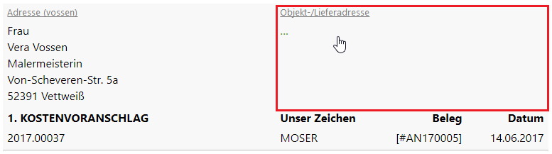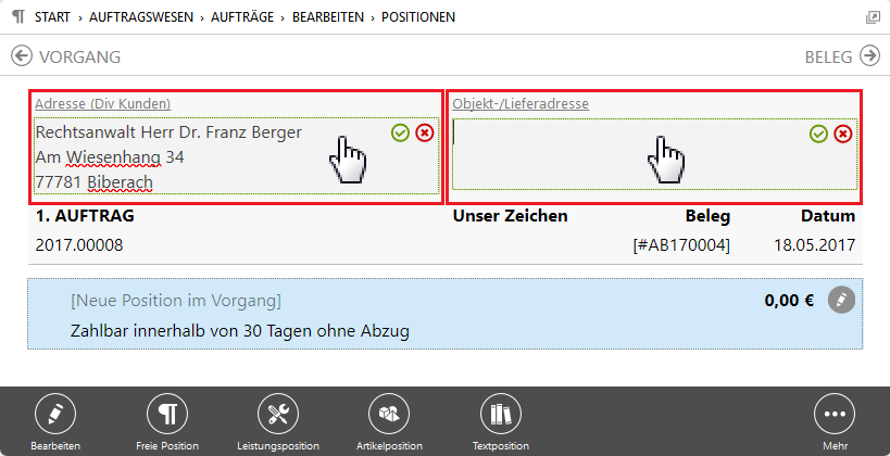 Adressänderung in der Positionsansicht In der Positionsansicht eines Vorgangs kann die Kundenadresse bzw. die Objekt-/Lieferadresse direkt angewählt und geändert werden. Hinweis