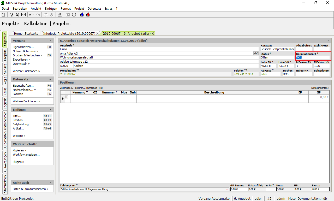 Erstellen Sie einen Kundenvorgang (z.B. Angebot) und stellen Sie im Vorgangskopf die Kalkulationsart auf einen der vordefinierten Werte VK 1 ... 5. Damit entscheiden Sie sich für den jeweiligen in Ihren Artikel- und Leistungsstammdaten vorgegebenen VK-Festpreis.