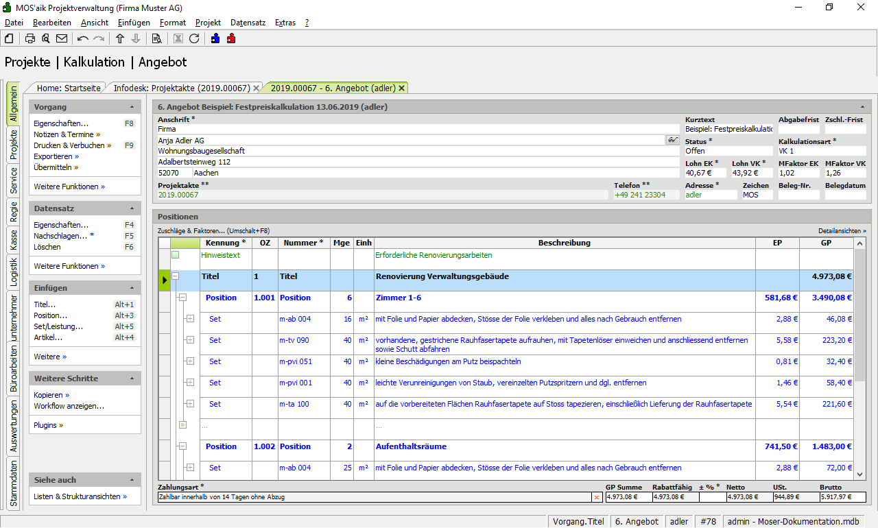 Erstellen Sie Ihr Leistungsverzeichnis, indem Sie z.B. Gliederungstexte (Titel, Abschnitte, Positionen, ...) sowie Artikel und Leistungen (Sets) einfügen. Die Berechnung aller Kosten und Preise erfolgt automatisch entsprechend der gewählten Kalkulationseinstellungen.