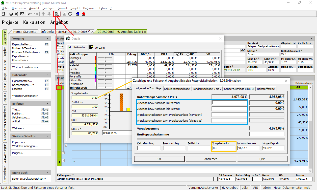 Klicken Sie auf das Eingabefeld Vorgabefaktor, um den Dialog Zuschläge und Faktoren zu öffnen und stellen Sie für eine korrekte Kostenberechnung den Schwierigkeitsgrad der durchzuführenden Arbeiten im Vorgabefaktor ein (hier: 0,5 ≙ 50% Minderaufwand). Sie können an dieser Stelle z.B. auch noch offene (blaue Markierung) Rabatte und Zuschläge festlegen. Drücken Sie anschließend OK.
