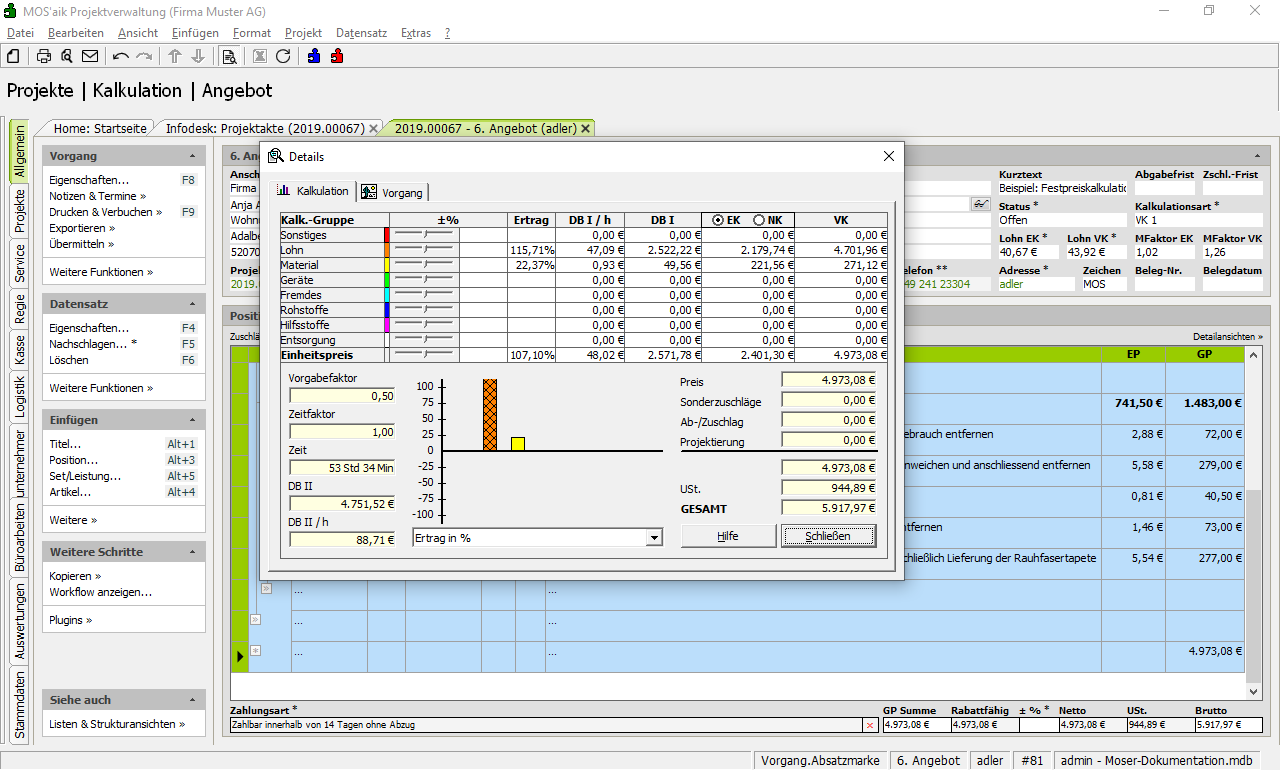 Das Fenster mit den Kalkulationsdetails berücksichtigt nun den reduzierten Zeitaufwand. Ertrag, Deckbeiträge, Kosten (EK) und Preise (VK) werden u.a. für alle Kalkulationsgruppen ermittelt und angezeigt. Schließen Sie den Dialog, wenn Sie mit dem Ergebnis Ihrer Kalkulation zufrieden sind. Der Vorgang kann jetzt gedruckt und das Angebot versendet werden.
