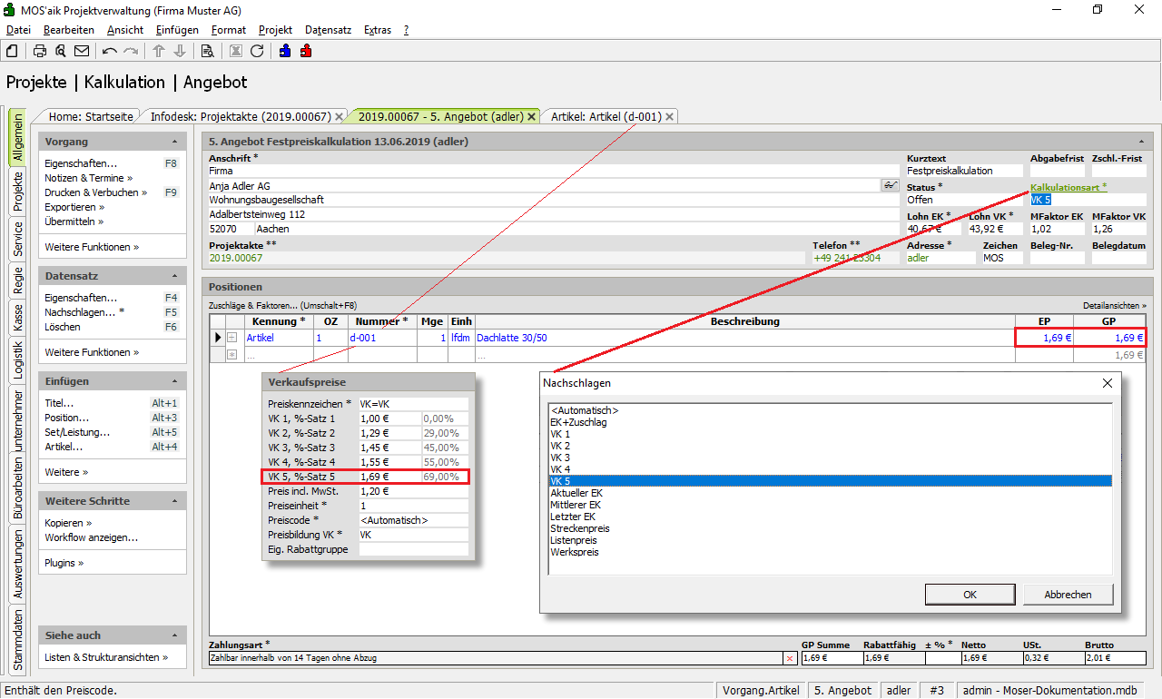 Im Beispiel wird die Kalkulationsart VK 5 gewählt und damit der im Artikel bzw. Set hinterlegte Verkaufspreis 5 (VK 5 bzw. Festpreis VK5) beim Einfügen übernommen (siehe Ausschnitt der Artikelstammdaten im blauen Rahmen).