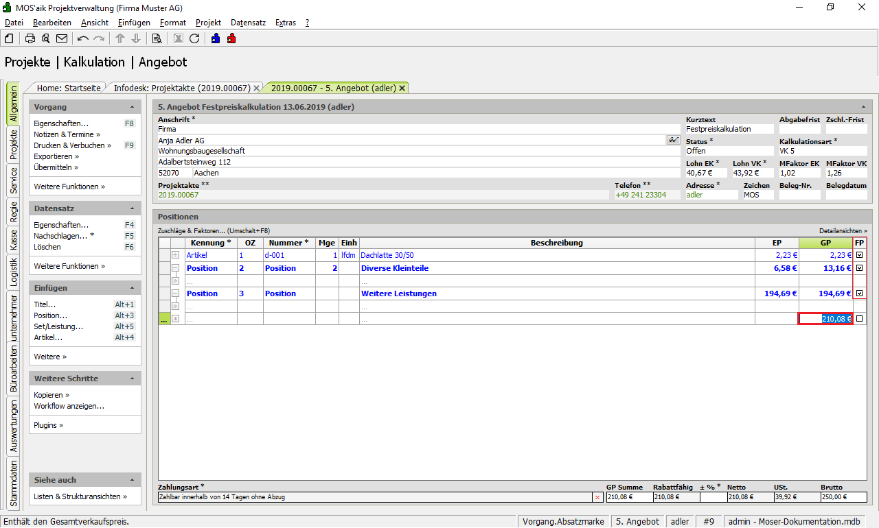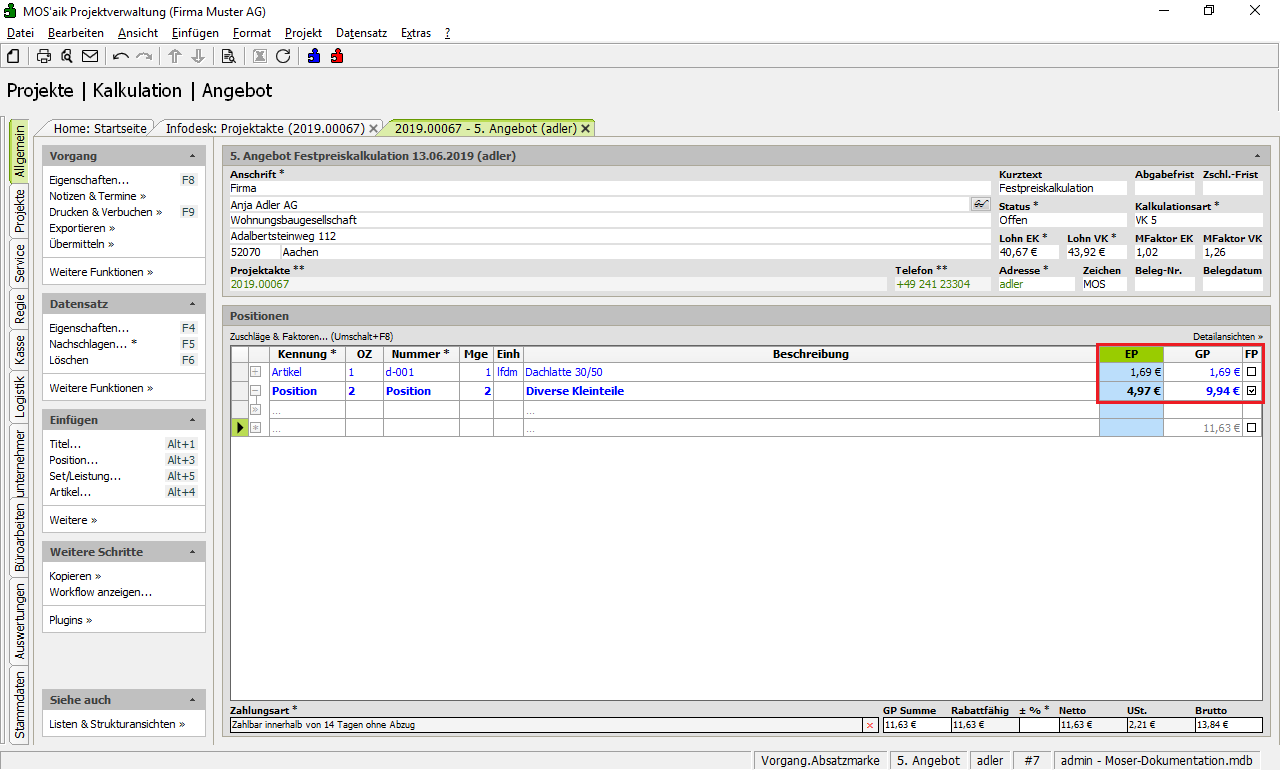 EP(Einzelpreis) oderGP(Gesamtpreis) zu ändern. Der Preis kann auf diese Weise unabhängig von Preisvorgaben in den Stammdaten festgelegt werden. Erkennbar ist diese Einstellung an der SpalteFP"Festpreis": Hier wird in diesem Fall ein Häkchen angezeigt. Die Spalte muss ggf. noch eingeblendet werden.Weitere Kalkulationseinstellungen haben auf derart geänderte Preise keine Auswirkung.