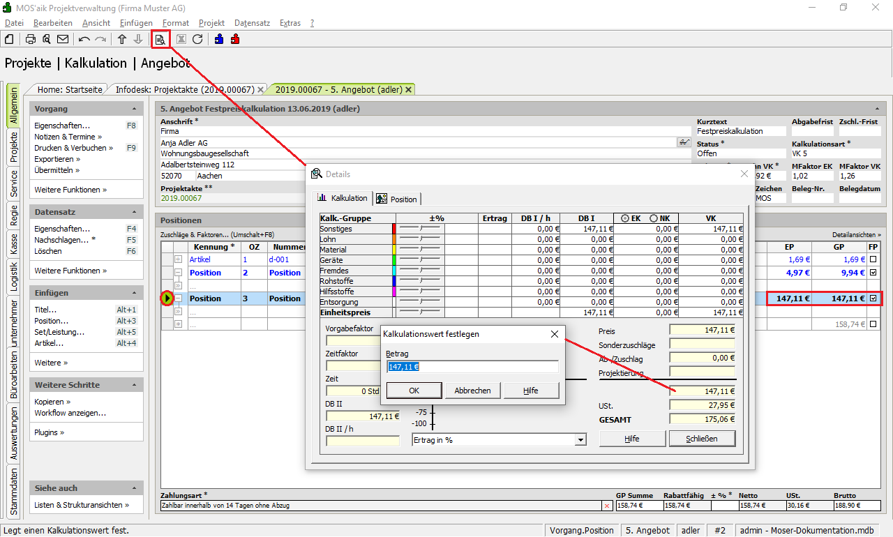 Weitere Informationen zur Festpreiskalkulation finden Sie unter Kalkulation - Beispiel: Festpreiskalkulation.
