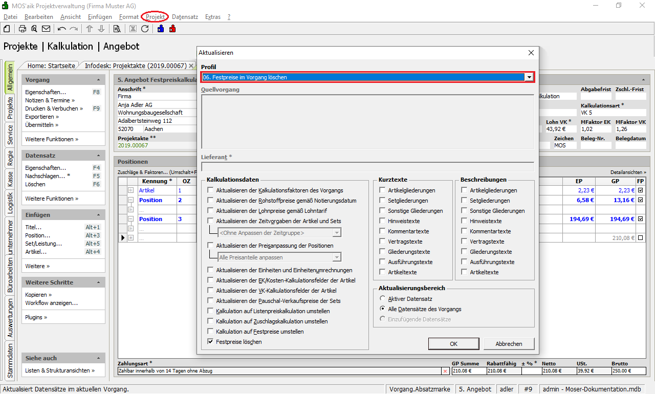FP.Wenn Sie alle Festpreise im Vorgang löschen möchten, rufen Sie dazu das Menü Projekt > Aktualisieren auf und wählen das