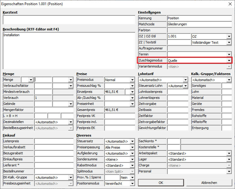 Wenn Sie nur die Verkaufspreise und nicht die Einkaufspreise bezuschlagen möchten, wählen Sie in den Positionseigenschaften den Zuschlagsmodus "Preiszuschlag".
