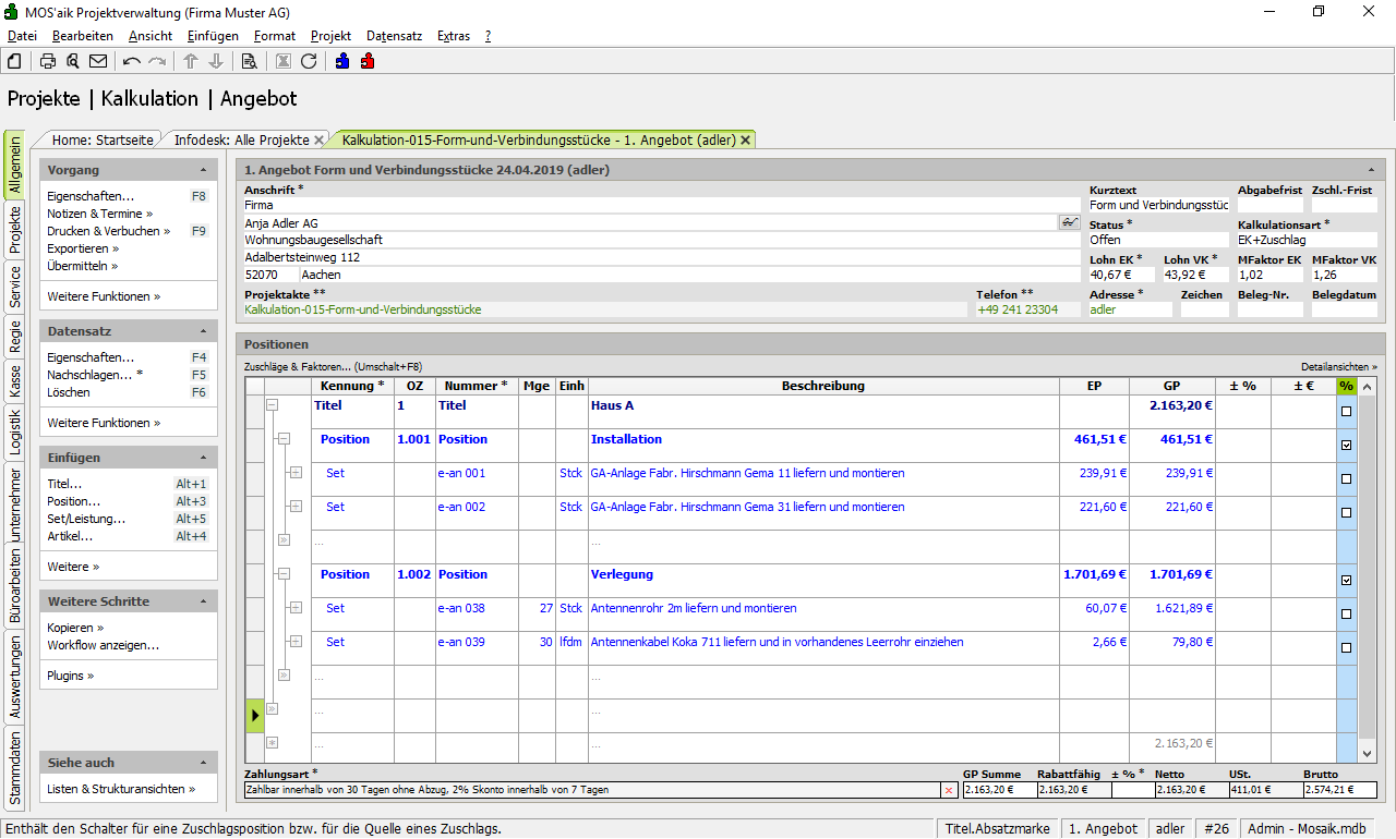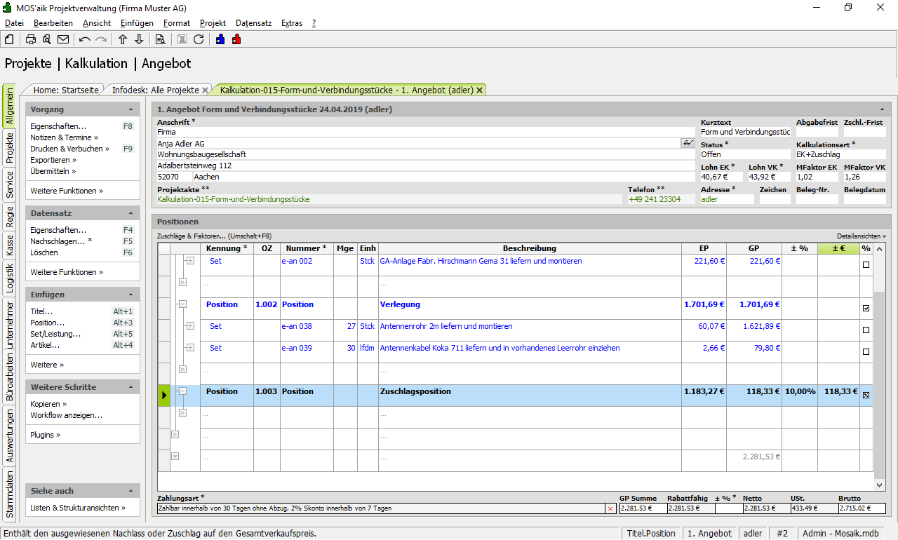 Sobald Sie die betreffenden Positionen als Quelle markiert haben, fügen Sie eine neue Position für den Zuschlag ein.