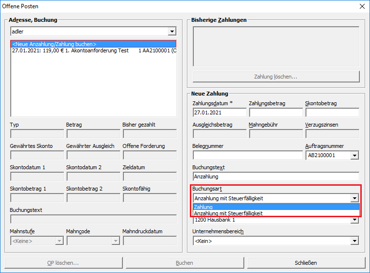 Abbildung 6.57. Neue Anzahlung/Zahlung buchen