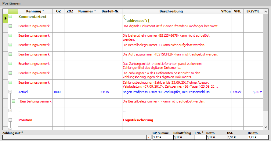 Prüfen Sie diese Vermerke und korrigieren Sie fehlerhafte oder unvollständige Angaben in Ihren Stammdaten bzw. klären Sie Widersprüche mit dem Lieferanten. Anschließend kann der unverbuchte Vorgang gelöscht und der Import wiederholt werden. Wiederholen Sie dieses Verfahren, bis möglichst keine Bearbeitungsvermerke mehr angezeigt werden.