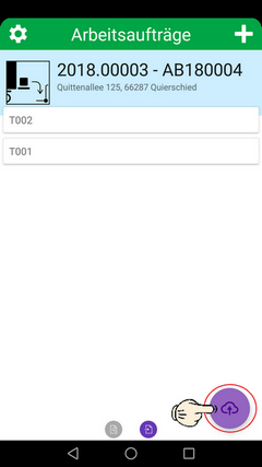 Tippen Sie auf die Schaltfläche mit der Wolke ("Cloud"), um die fertiggestellten Vorgänge zu übermitteln. Dazu wird das im Bereich "Einstellungen" (siehe Abschnitt 2.1.6, „Einstellungen“) gewählte Übertragungsformat (z.B. FTP oder E-Mail) verwendet.