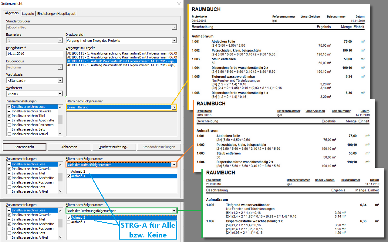 Beim Druck von Aufmaßvorgängen (Typ Raum, Position oder REB) kann über den Filter Filtern nach Folgenummer gewählt werden, ob entweder alle oder nur ausgewählte Aufmaß- bzw. Rechnungsfolgenummern berücksichtigt werden sollen.