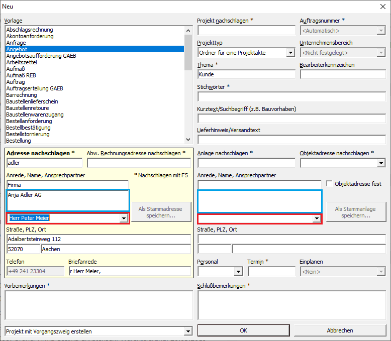 Wählen Sie im Erstellungsdialog für Vorgänge und Projekte zunächst die Adresse aus: