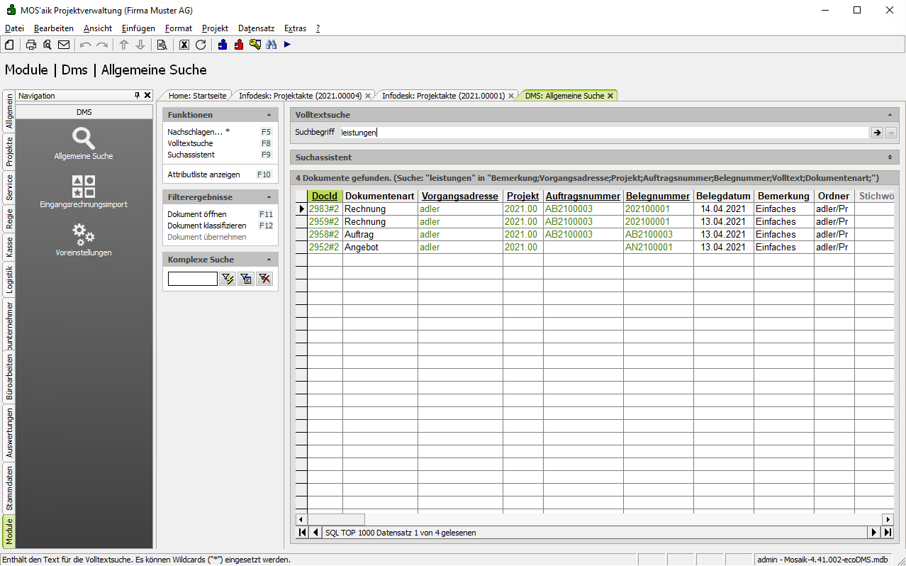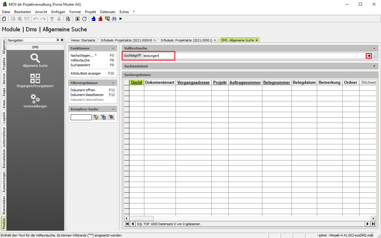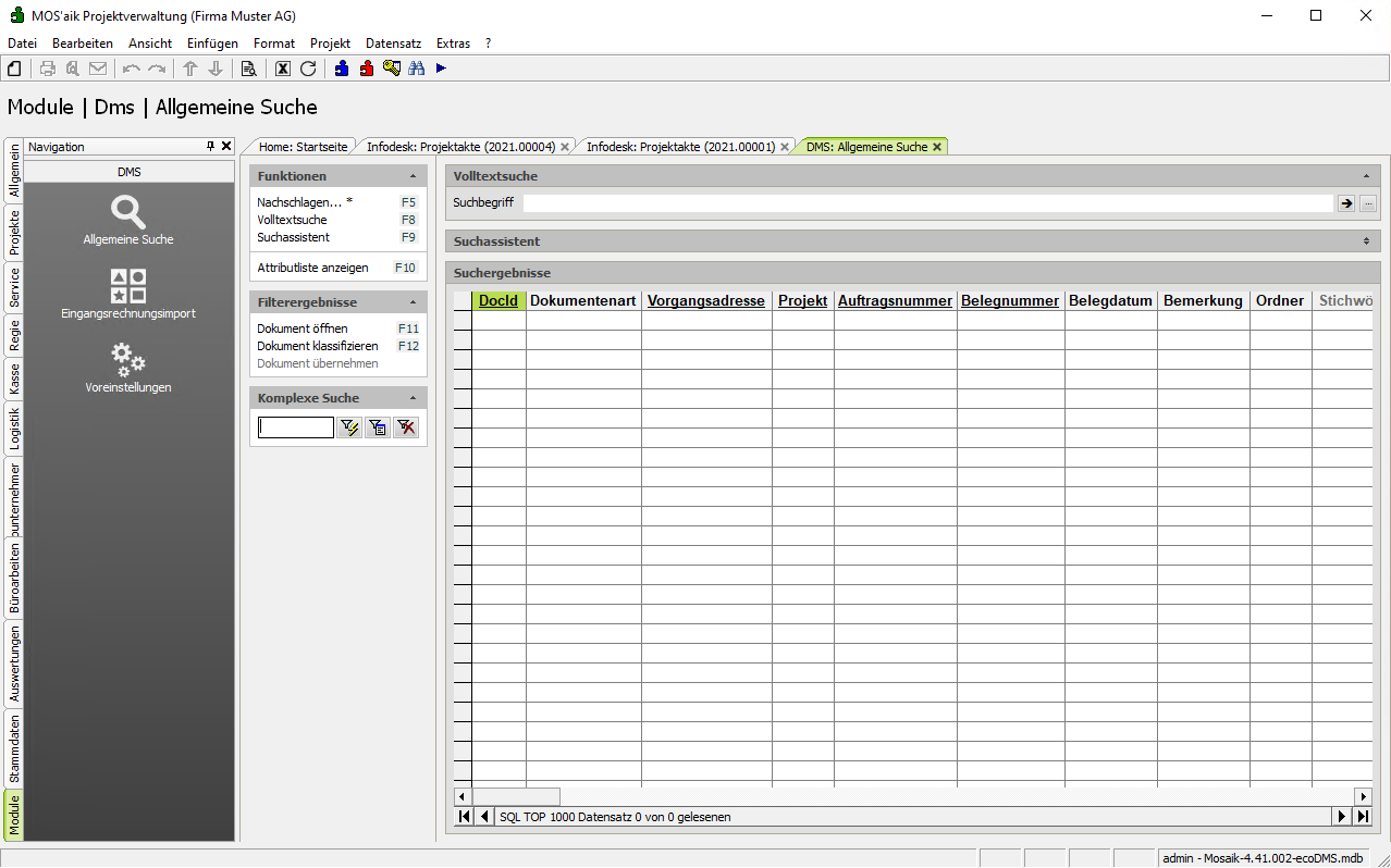 Im Arbeitsblatt Module | DMS | Allgemeine Suche kann eine Volltextsuche über Informationen in archivierten Dokumenten ausgeführt werden. Grundsätzlich durchsucht die Volltextsuche zunächst keine mit den Dateien gespeicherten Attribute, diese kann jedoch über eine erweiterte Volltextsuche ermöglicht werden.