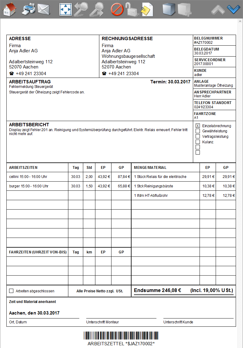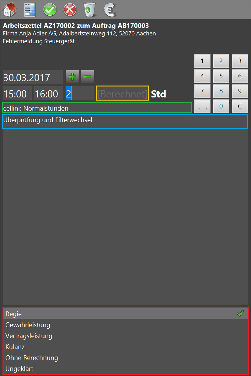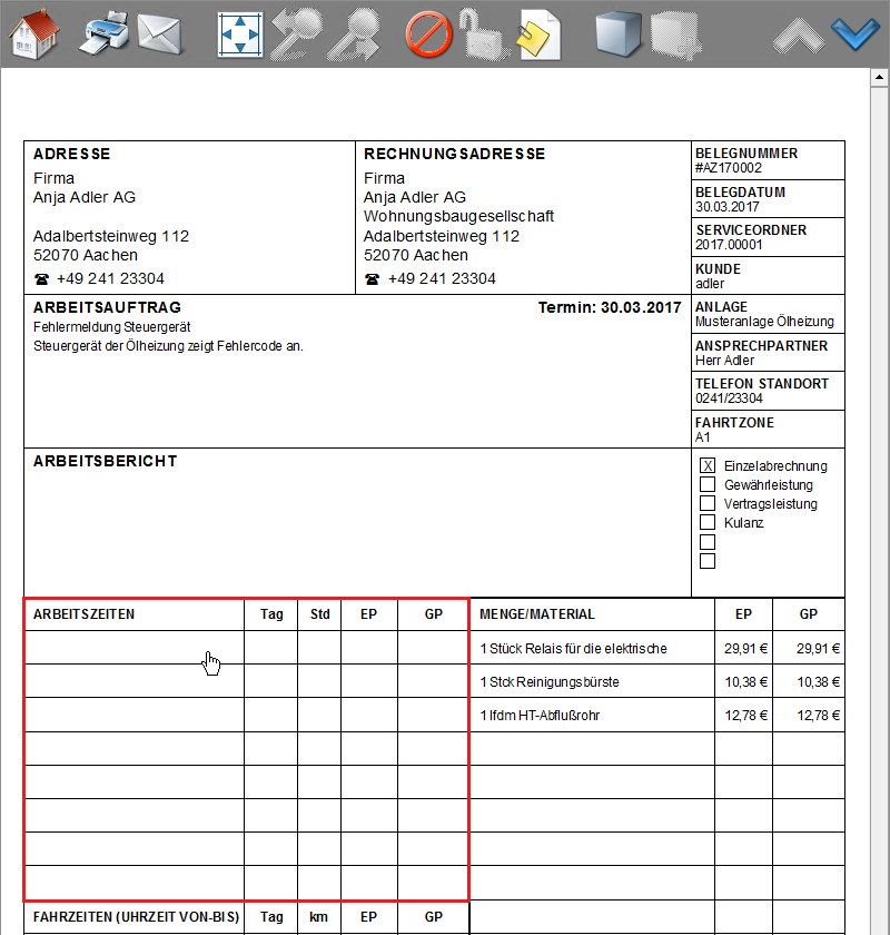 Zum Erfassen der Arbeitszeiten tippen Sie auf der ersten Seite des Arbeitszettels in den markierten Bereich. Zur grundsätzlichen Erfassung von Mitarbeiterarbeitszeiten siehe auch den Themenbereich Serviceaufträge mit Regieabrechnung. |