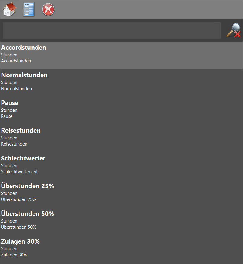 Es werden nur die Lohnarten angezeigt, die Sie im Abschnitt Abschnitt 3.2.3, „Lohnartenstammdaten“ für den mobilen Service ausgewählt haben! Wählen Sie eine Lohnart durch Antippen aus. Beispiel 5.1. Lohnart