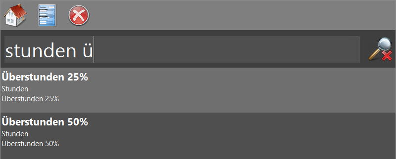 Sie können im Suchfeld einen Begriff erfassen, nach dem im Kurztext der Lohnarten gesucht wird. Die Eingabe von Begriffen im Suchfeld reduziert die Liste der angezeigten Ergebnisse schon beim (Vor-) Tippen auf solche, die alle Begriffe enthalten. Die Suche berücksichtigt lediglich Begriffe, die im Kurztext der Lohnarten vorkommen. Mit dem Symbol