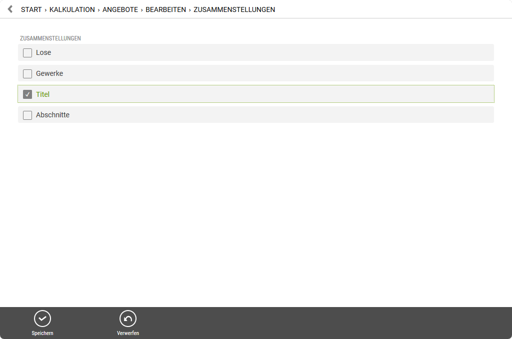 Für den Druck von Vorgängen können optional Zusammenstellungen der Gliederungen Los, Gewerk, Titel und Abschnitt ausgewählt können.