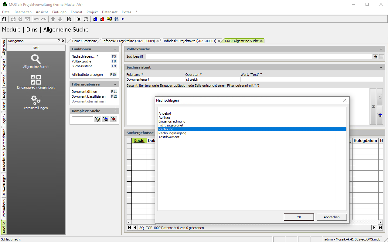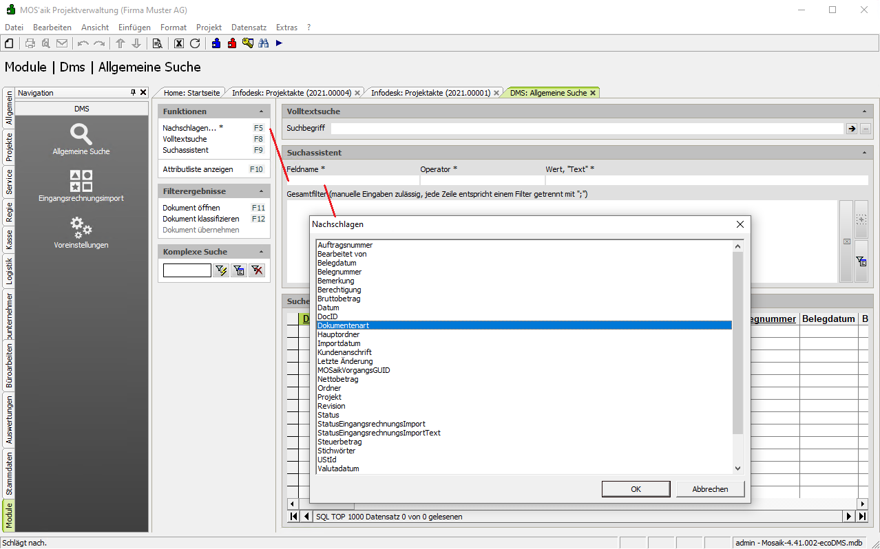Im Arbeitsblatt Module | DMS | Allgemeine