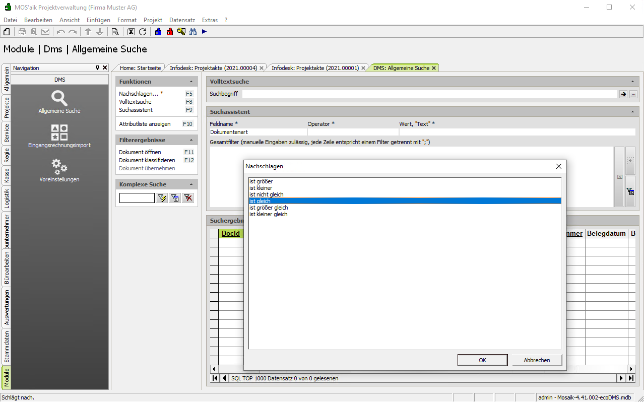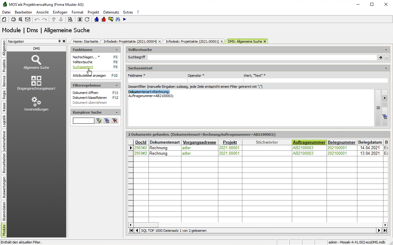 Suchassistenten können komplexe Filter anhand von Feldern (z.B. Klassifizierungsattributen, Dokumentenarten), Operatoren und gesuchten Werten