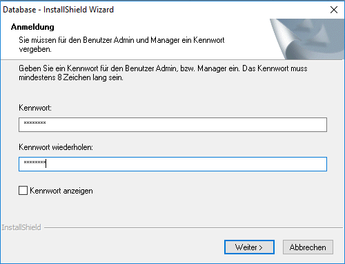 Anmeldung Dieser Dialog ist nur für die Einrichtung von SQL-Datenbanken verfügbar. Geben Sie ein persönliches Kennwort für die Benutzer Admin und Manager ein (mindestens 8 Zeichen) und bewahren Sie dieses sorgfältig auf. Das Kennwort muss dazu zweimal identisch eingegeben werden. Zur Kontrolle kann die Eingabe mit dem Schalter Kennwort anzeigen im Klartext angezeigt werden.
