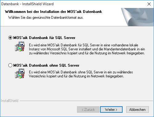 Prinzipiell werden Datenbanken mit oder ohne Microsoft SQL Server® unterstützt. Die Installation der MOS'aik Datenbank ohne SQL Server® wird nur für Testzwecke im Rahmen von MOS'aik unterstützt. Der "hybride" Einsatz von Funktionen der neuen Moser Produktgeneration ist damit nicht möglich.