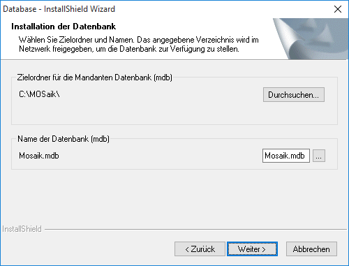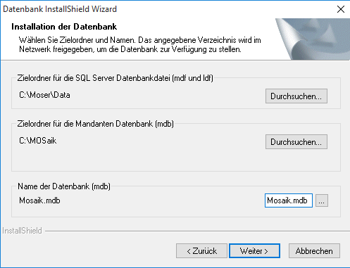 Zusätzlich muss sichergestellt sein, dass jeder MOS'aik-Benutzer Zugriffsrechte für den gewählten Ordner hat. Siehe dazu auch Abschnitt 1.4.2, „Dateizugriffsrechte“. Alternative 1 MOS'aik Datenbank für SQL Server installieren