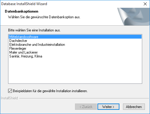 Datenbankoptionen Bereitstellung von Musterdaten in der Datenbank Beispieldaten für die gewählte Installation installieren Im letzten Schritt der Einrichtung einer neuen Datenbank können Sie über einen Schalter entscheiden, ob Musterdaten in der Datenbank enthalten sein sollen. Setzen Sie dazu das Häkchen und wählen Sie die gewünschte Branche oder Mittelstandssoftware, um alle Musterdaten zu installieren. Wenn das Häkchen nicht gesetzt ist, werden lediglich einige Kunden- und Lieferantenadressen vorinstalliert, die für die Verwendung der jeweiligen Schnittstellen erforderlich sind. Beispiele dafür sind z.B. mareon (Service-Portal für eine Handwerkeranbindung der Firma Aareon) oder sonepar (Lieferantenportal).