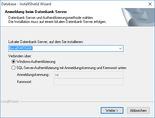 Die Installation der MOS'aik Datenbank ohne SQL Server® wird nur für Testzwecke unterstützt.