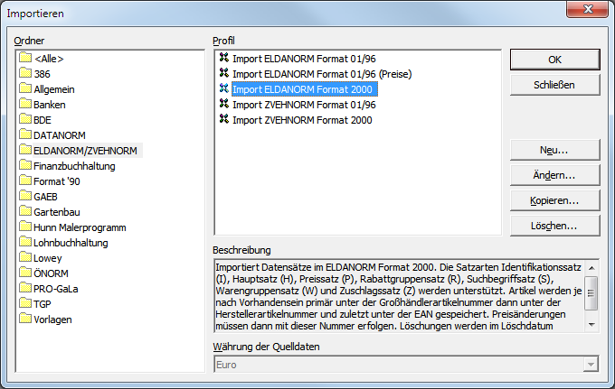 ELDANORM/ZVEHNORMund wählen Sie das Profil Import ELDANORM Format 2000 aus.Bestätigen Sie die Auswahl mit OK.