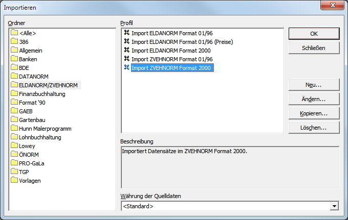 ELDANORM/ZVEHNORMund wählen Sie das Profil Import ZVEHNORM Format 2000 aus.Bestätigen Sie die Auswahl mit OK.