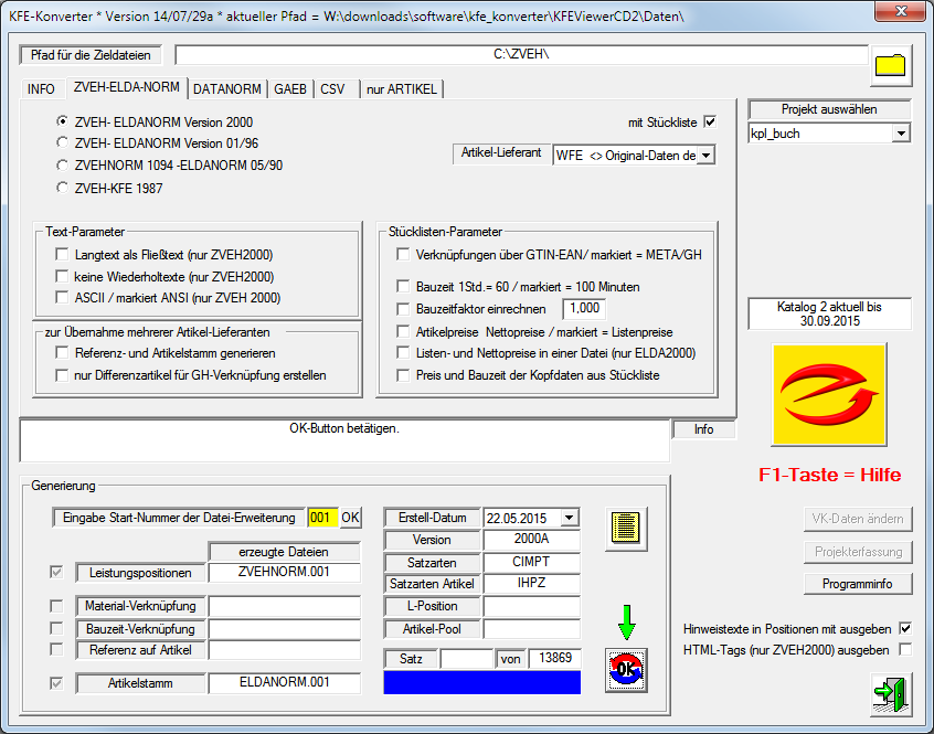 ELDANORM.001undZVEHNORM.001mit den KFE-Artikeln sowie den Leistungsdaten z.B. in das VerzeichnisC:\ZVEH. Wählen Sie dazu das Format ZVEHNORM 2000 aus (s. Abschnitt 1.1.2, „KFE Konverter“).Abbildung 2.9. Dateigenerierung KFE-Konverter mit Stückliste (ZVEH-ELDANORM 2000)